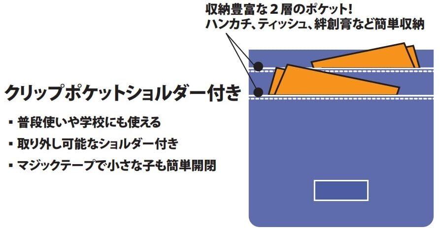 ランドセルなどに取り付けて使えるクリップポケット、ショルダー付きで単体での使用も可能