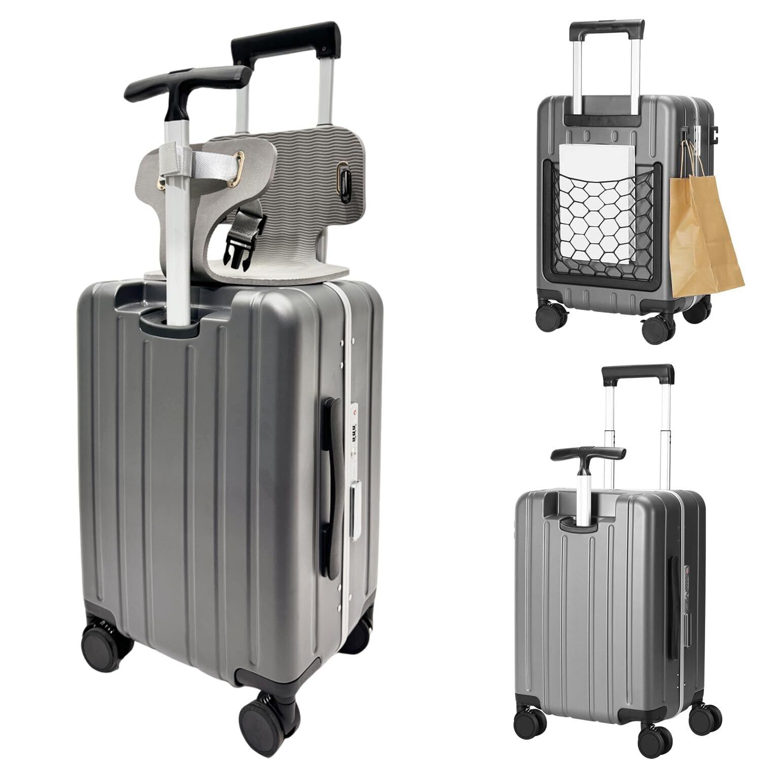 【新しい便利機能】伸縮ネットポケットが付いていて、おもちゃや人形などを収納できます。また、付属するクッションシートを外せば通常の機内持ち込みスーツケースになり、子供と一緒しなくても利用できます。2つのフックが付いているため、手がふさがることはありません。さらに、キャリーバーの取っ手にはスマホスタンドがついており、待ち時間にも便利に活用できます!