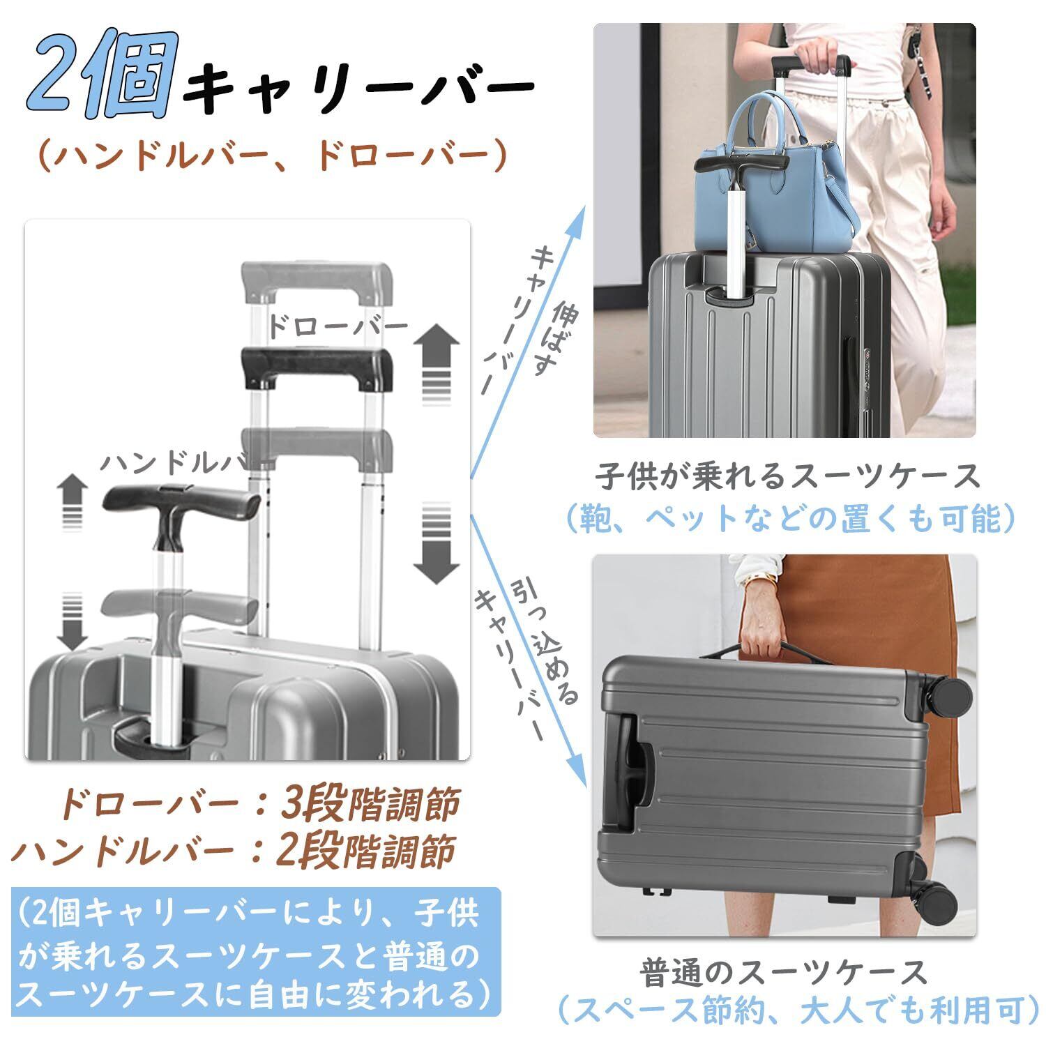 【新登場、多機能子供乗れるスーツケース】お子様を乗せてスムーズに移動できるキャリーケース。この商品1点だけで、親は抱っこから解放され、快適に旅行を楽しむことができる。それに、伸縮ネットポケット、サイドフック、携帯電話ホルダー付きという機能を加え、より便利になります。