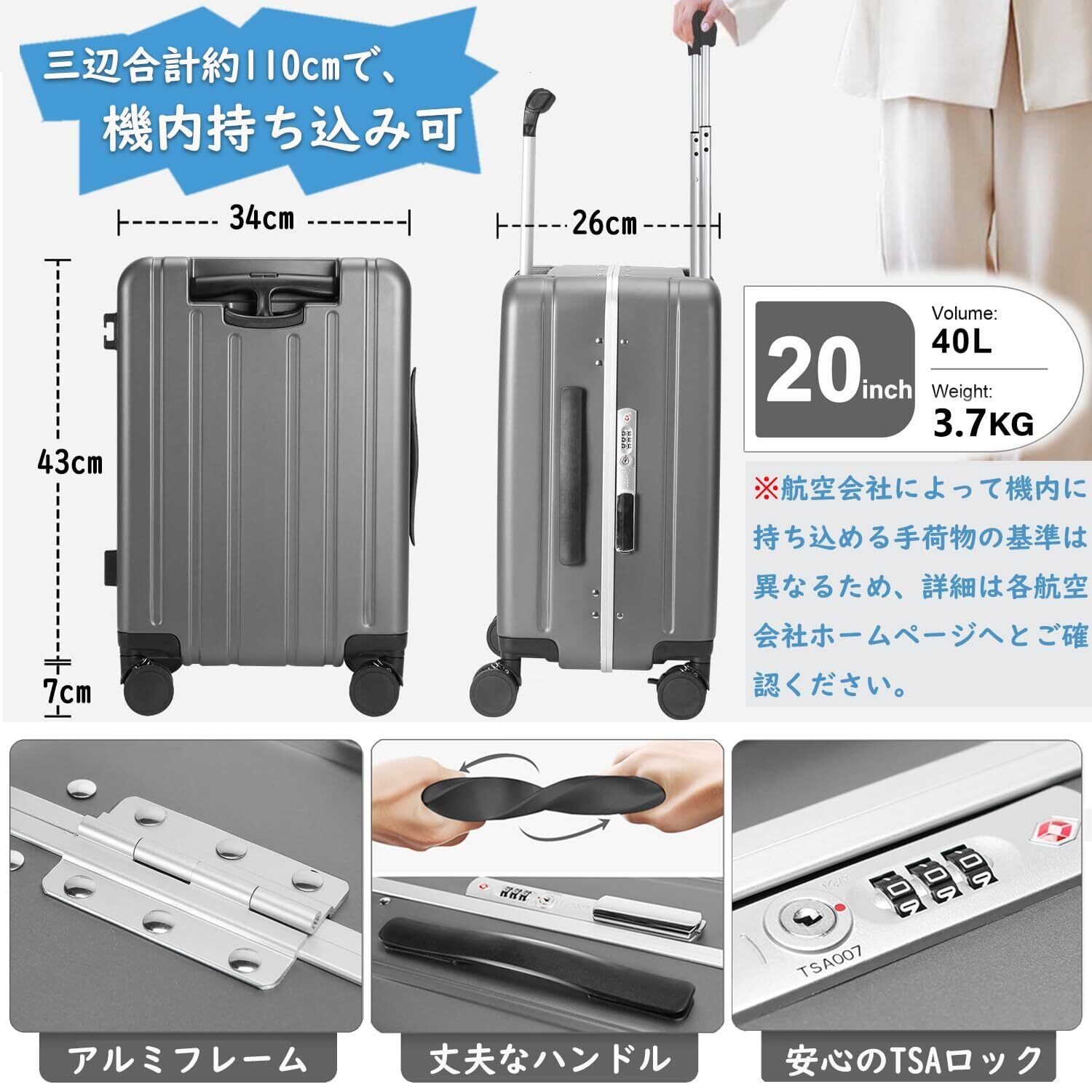 【こだわりの機能】①ABSとPC樹脂を混合して耐久性が高いハードタイプの高品質ボディを実現、その上、アルミフレームの採用により、外部からの衝撃や圧力に強く中身をしっかり保護します。②軽量かつ頑丈なアルミ製のハンドルバーは2段階調節、キャリーバーは3段階調節が可能、ボタンワンプッシュで身長や利用シーンに合わせて調整ができます。③海外旅行には欠かせないTSAダイヤル方式のロックが搭載されており、外出がより安全になります。
