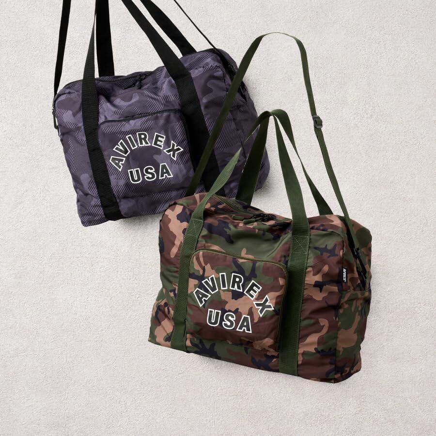 AVIREXスーツケースのスーツケースはもちろん、様々なサイズのスーツケースのハンドル部分にも取り付けられる便利な仕様です。また、斜め掛けができるショルダーベルトも付いているので旅行には最適な収納グッズです。 迷彩柄にブランドのアイコンであるAVIREX USAロゴが入っています。旅先で増えた荷物やお土産を収納し、スーツケースの上に乗せて一緒に運べます。ショルダーベルトも付属していて便利です。