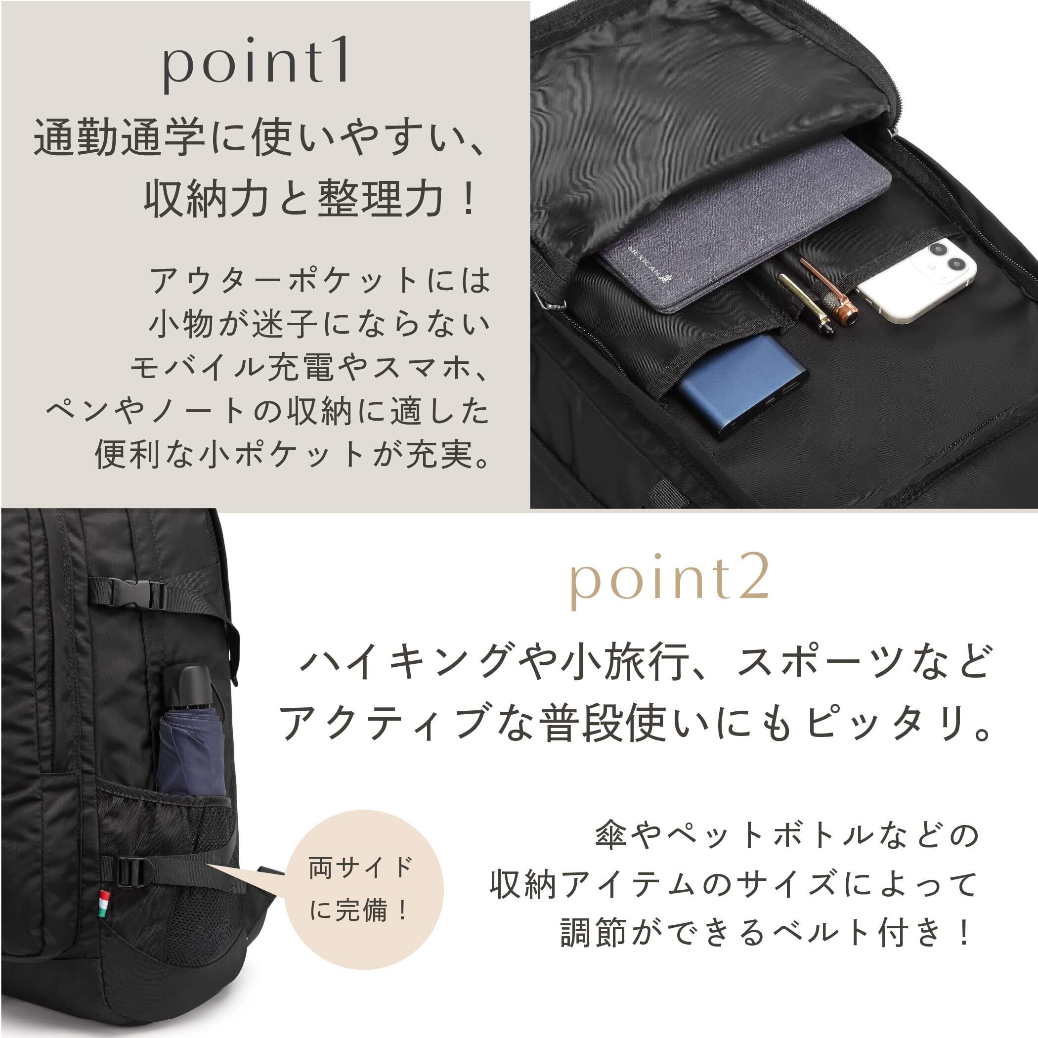 タウンユースからアウトドアまで使える軽量で収納力抜群のバックパックが登場!①背面にはメッシュ素材を使い、不快なムレを軽減②背面はもちろんショルダーにもクッション入り③サイドポケットにはペットボトルなど収納に合わせられるベルト付きで安心して入れられハイキングや小旅行、スポーツなどアクティブな普段使いにピッタリ。④世代や男女問わずにオールシーズン使えます。