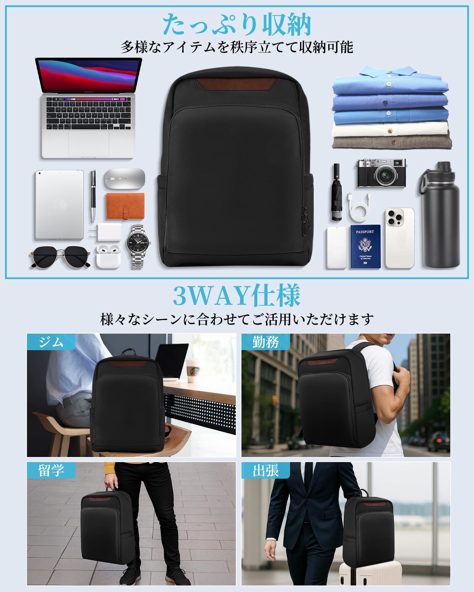 【収納力抜群・使いやすさ】ビジネスリュックのフロントポケットは仕切り構造で、ペン・メガネ・スマホなど小物を瞬時に整理可能。メイン収納層には広々生活用品収納空間+専用ノートPCポケット(15.6インチ対応)を内蔵し、スーツや書類とPCを同時に安全に収納。ビジネス出張から週末旅行まで、シンプルな構造で効率的な収納を実現するリュック。