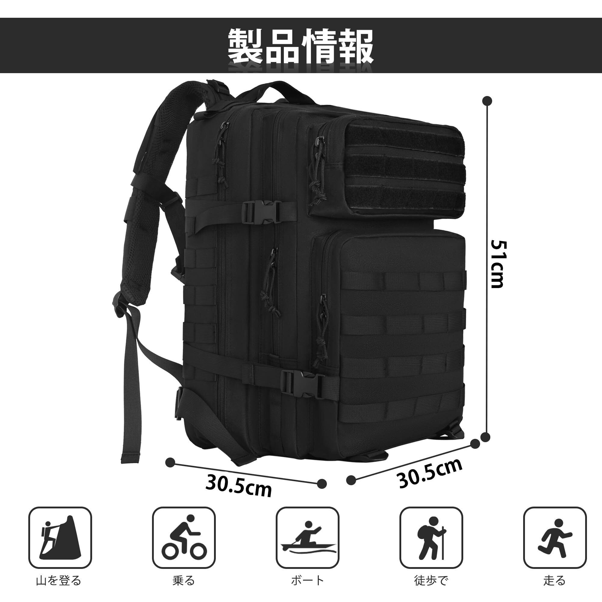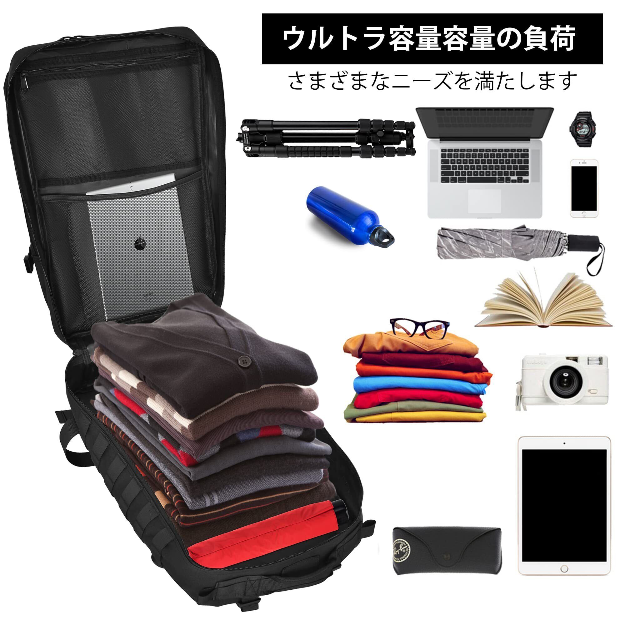 【十分なスペース】このタクティカルバックパックのおおよその寸法は51 x 30.5 x 30.5 cm、容量は45リットルです。大きな多層の内部収納コンパートメントには、アウトドア用品をたっぷり収納できます。日常の旅行ニーズに応えます。フィットネス、アウトドア旅行、ハイキングなどのアウトドアアクティビティに最適です。