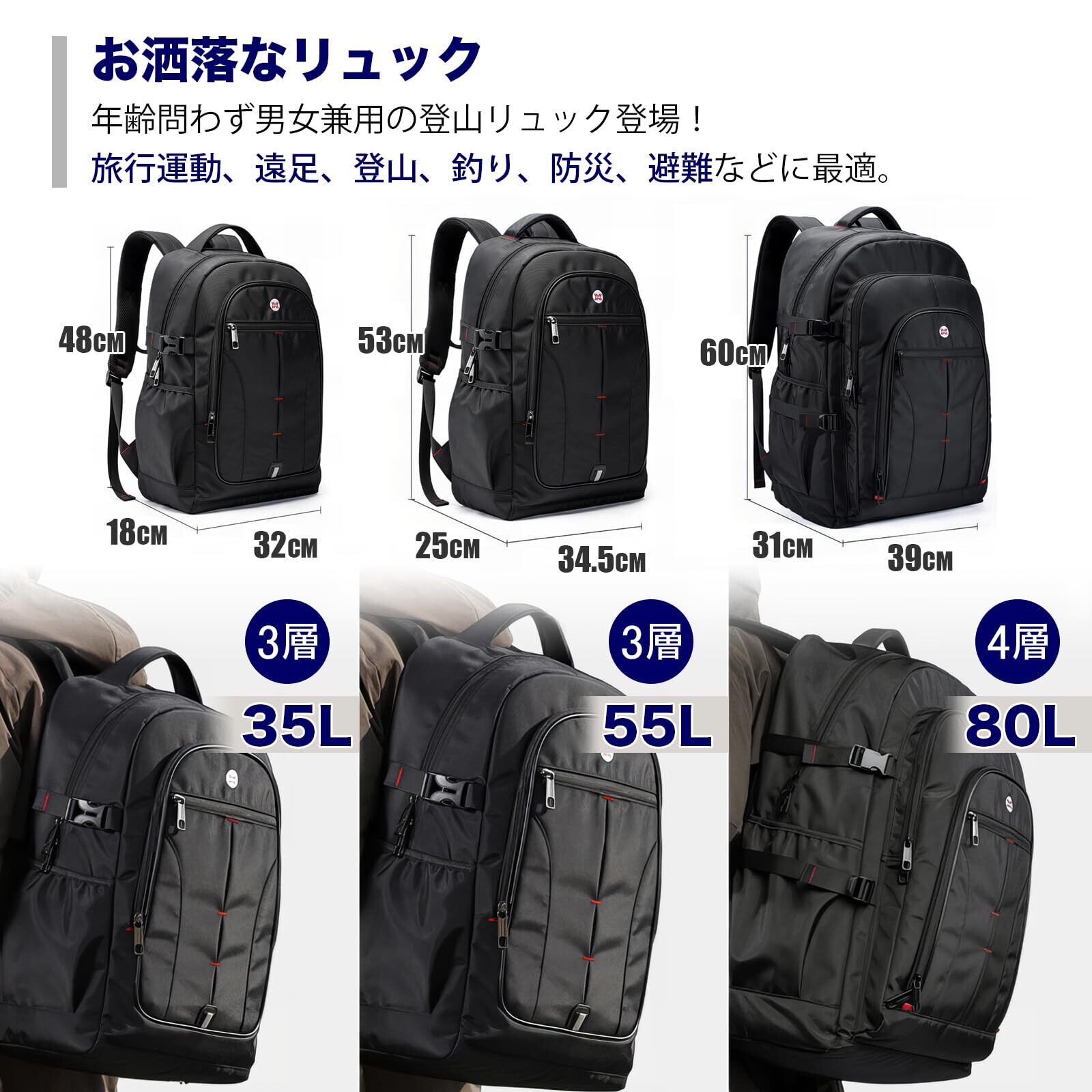 【大容量の80L防水リュックサック】サイズ:約縦60cm × 横39cm × マチ31cm、収納可能サイズ: 61-80L(物でいっぱいのすべてのポケット) 重さ:1.6Kg。スクエア型収納力抜群、最大17インチPC、Pad、A4サイズの書類や着替え、サングラス、帽子など必要なアイテムを、まとめて収納。キャンプや登山道具、旅行なら3~5泊分の荷物が余裕で入り、タウンユースだけでなく、非常時持ち出し用の防災リュックとしても十分ご活用いただけます。