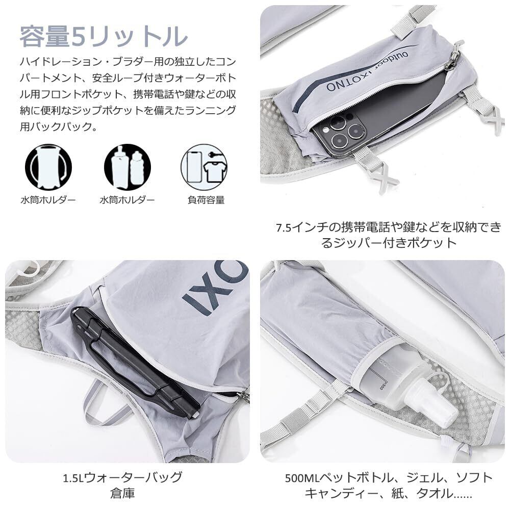 【ランニング中の水分補給】 5Lトレイルランニング ザック、2つの水タンクを備え、それぞれ 1.5Lウォーター ブラダーと 500ml ソフト ボトルを収納できます (ブラダーとソフト ボトルは付属していません)。 一口食べるだけで直接飲めるので、いつでもどこでも水分補給でき、ペースにもまったく影響しません。バックパックの前面にある伸縮性のあるストラップとホース ストラップを組み合わせることで、飲むときにぐらついたり、跳ねたり、音を立てたりすることがありません。