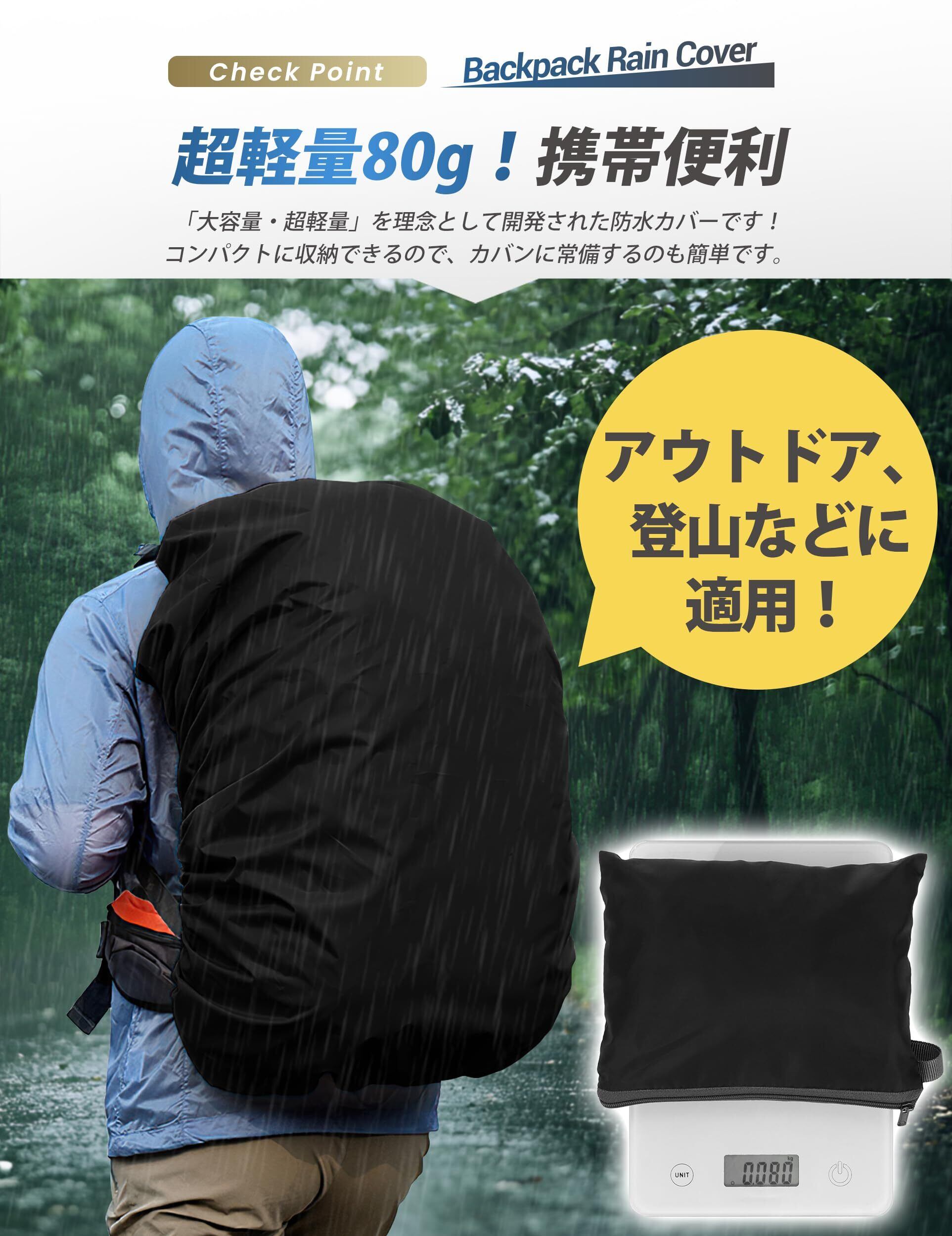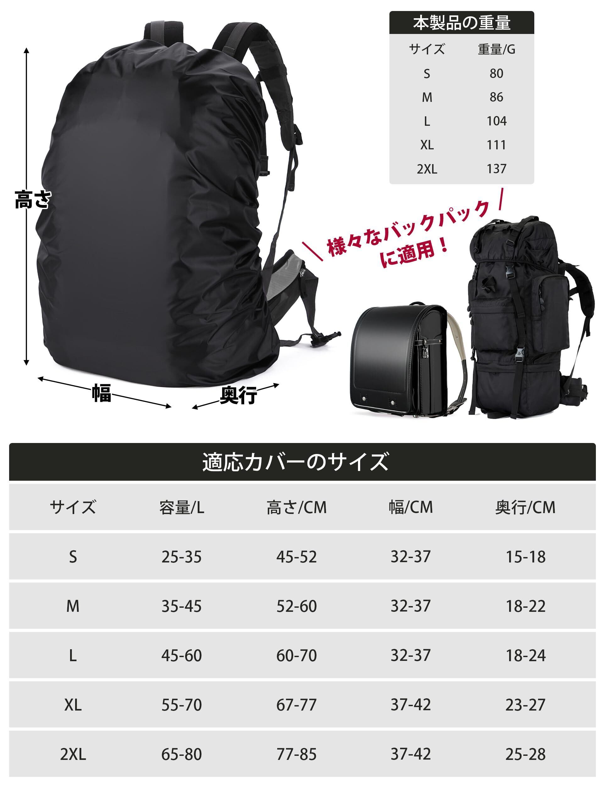 【超軽量80g!落下防止】「大容量・超軽量」を理念として開発された防水カバーです!驚きの軽さ→S→80g、M→86g、L→104g、XL→111g、XXL→137g。収納袋でコンパクトに収納できるので、リュックに常備するのも簡単です。一方、レインカバーリュックは荷物梱包に多く使われる調節可能十字型ベルトを縫製し、強力バックルを押し込むと外れにくい。