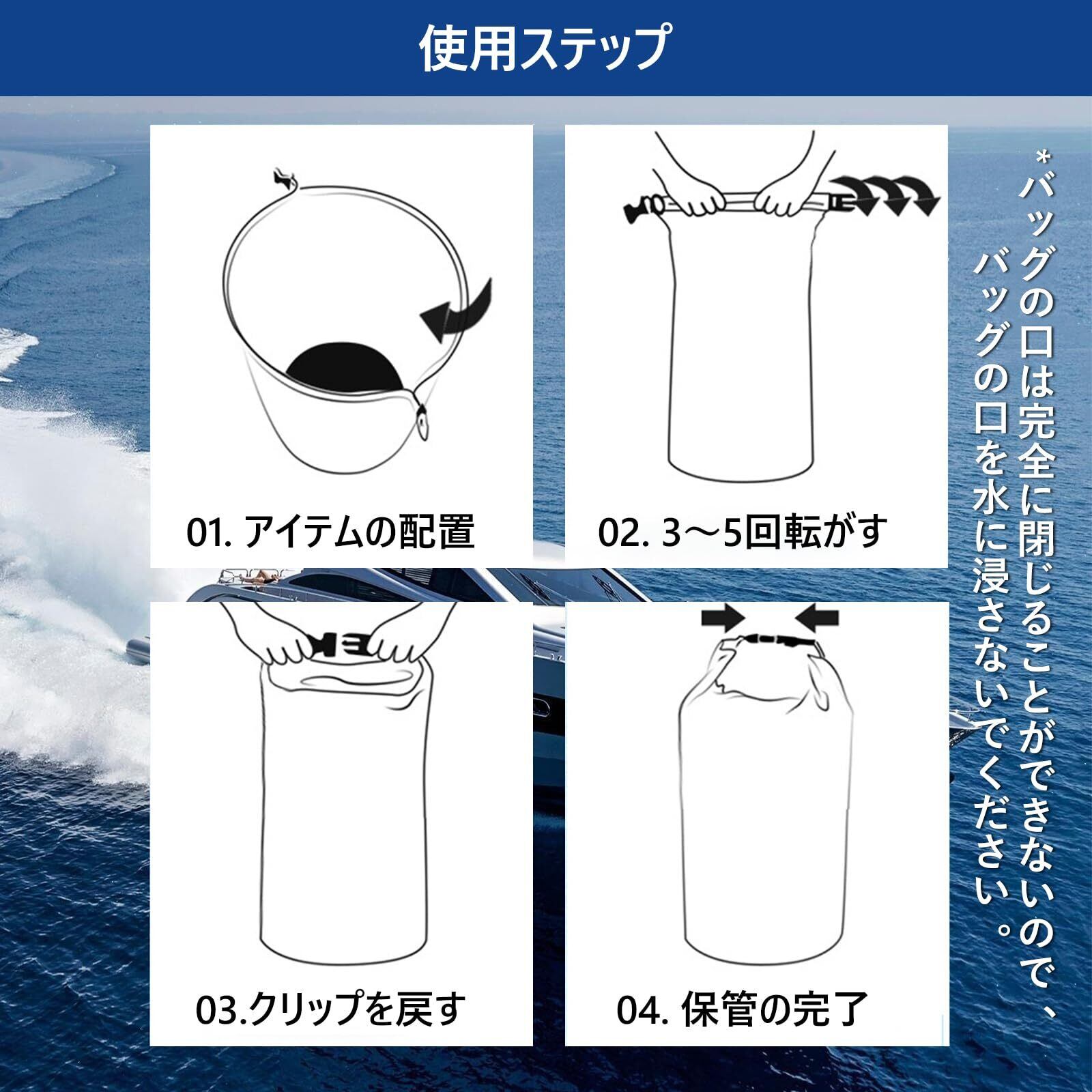 【簡単操作|確実防水】荷物を入れて巻き口を3~5回転がし、バックルで固定するだけの簡単設計。巻き口閉じ部分の一時的な浸水を防ぎ、荷物を水・汚れ・埃から確実に保護。メンテナンスは表面を乾いた布で拭き、自然乾燥させるだけでOK。柔軟性を長期間維持します。