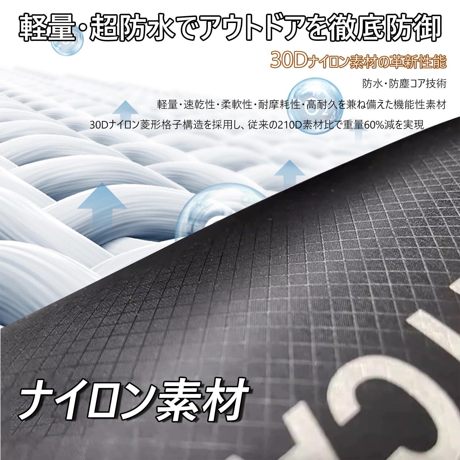 【超軽量&コンパクト|携帯性抜群】軽量で快適に持ち運ぶことができ、ほとんどスペースを取りません。平時のサイズ・重量:3L: 高さ約32cm×幅約24cm (約41.5g);5L: 高さ約41cm×幅約25cm (約42g);10L: 高さ約51cm×幅約29cm (約57.5g);20L: 高さ約61cm×幅約34cm (約60g);35L: 高さ約77cm×幅約44cm (約94g)。 ※注意: 素材・構造上防水性能を有しますが、長時間の水没は避けてください。完全防水を保証するものではありません。