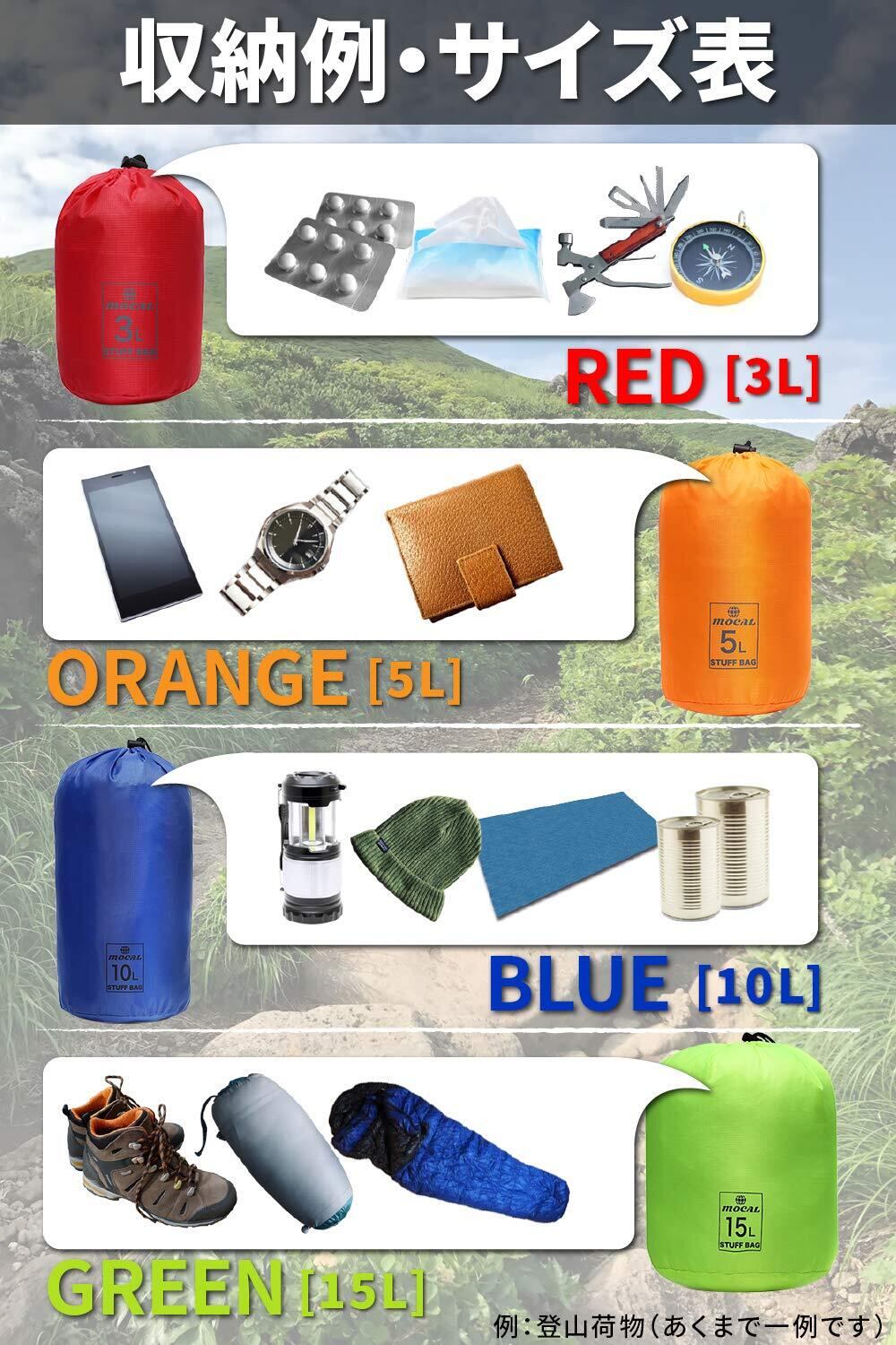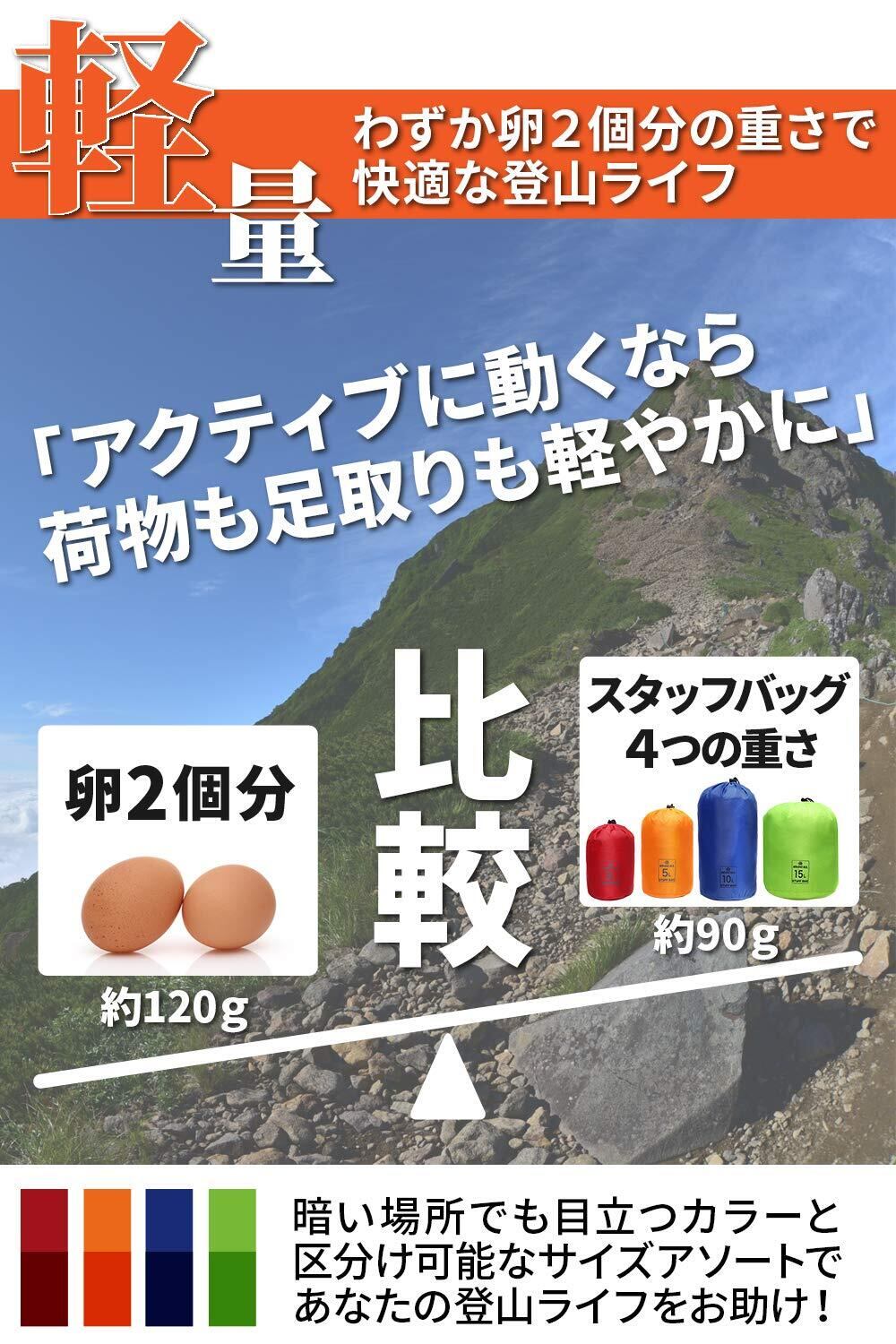 【小分けしやすい各サイズ内容】サイズの違う4種類のセット品です。登山では、荷物が多すぎず、少なすぎずが鉄則です。利用シーンによって一概には言えませんが、スタッフバッグ初心者の方に向けて、各サイズの収納例を掲載させていただきます。あくまで目安なので、用途によって仕分けてください。レッド(3L):小物(ティッシュ・コンパス・薬)、オレンジ(5L):貴重品(スマホ・財布・時計)、ブルー(10L):アウトドア必需品(ランプ・行動食・レジャーシート)、グリーン(15L):大物(着替え・寝袋・靴)