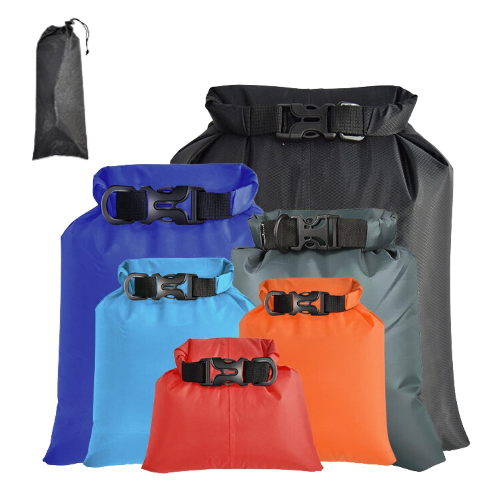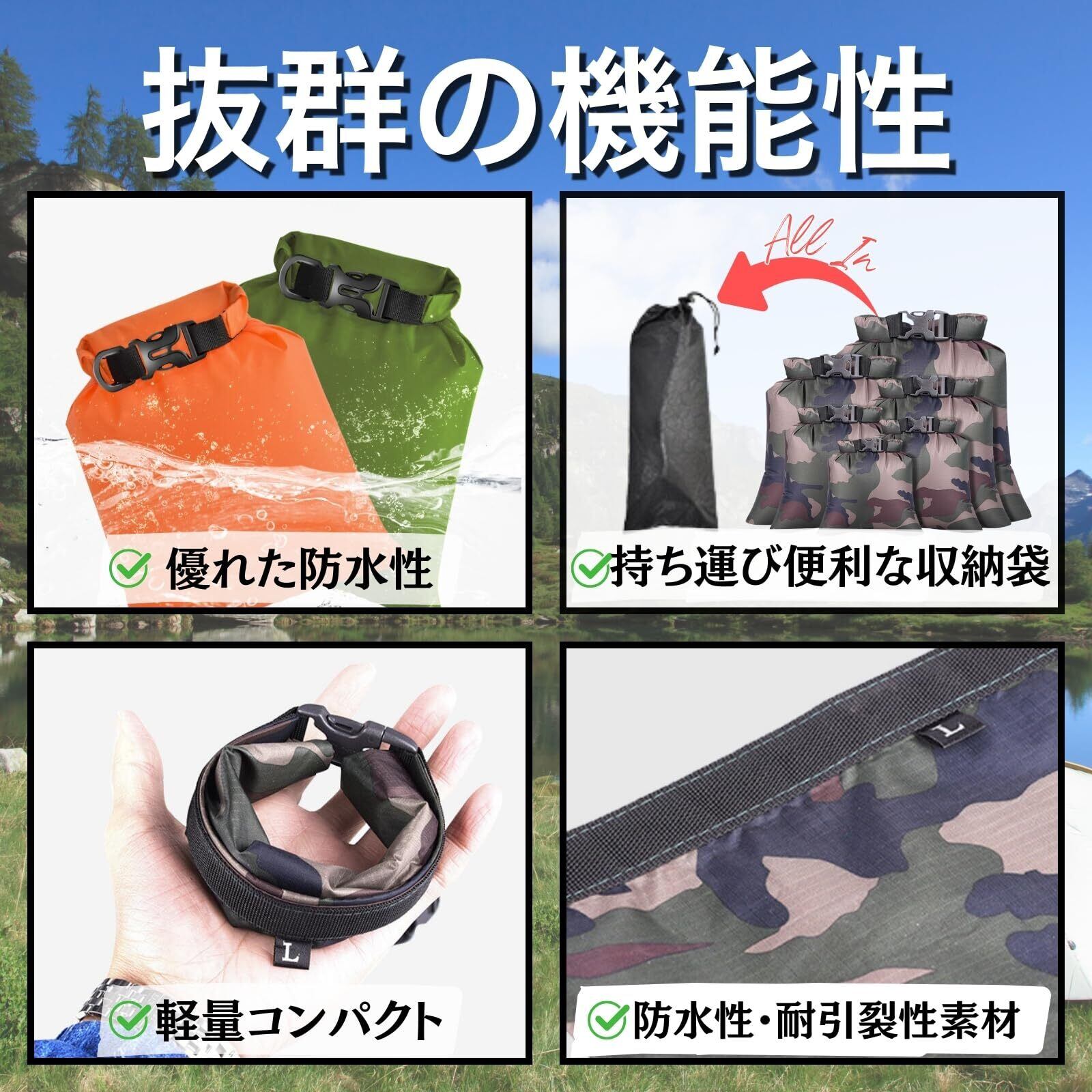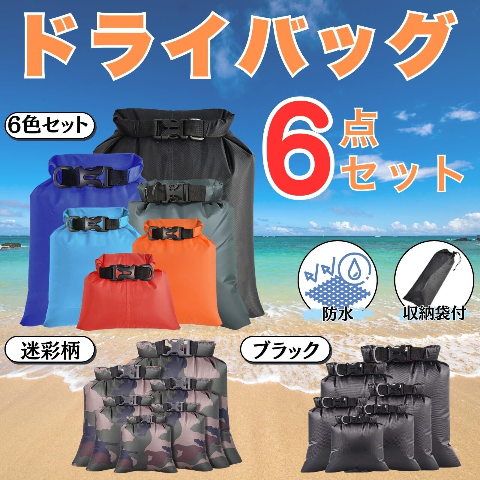 【多用途】様々なアウトドアアクティビティに対応する防水ドライバッグ6枚セット。キャンプ、ハイキング、水泳、海水浴、釣り、ラフティングなどで様々なシーンで活躍します。