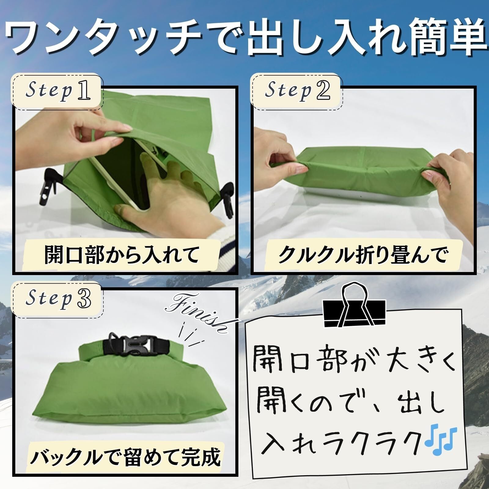 【簡単密閉】ロールトップ式の密閉システムで、水の浸入を防ぎます。開閉や出し入れも簡単です。