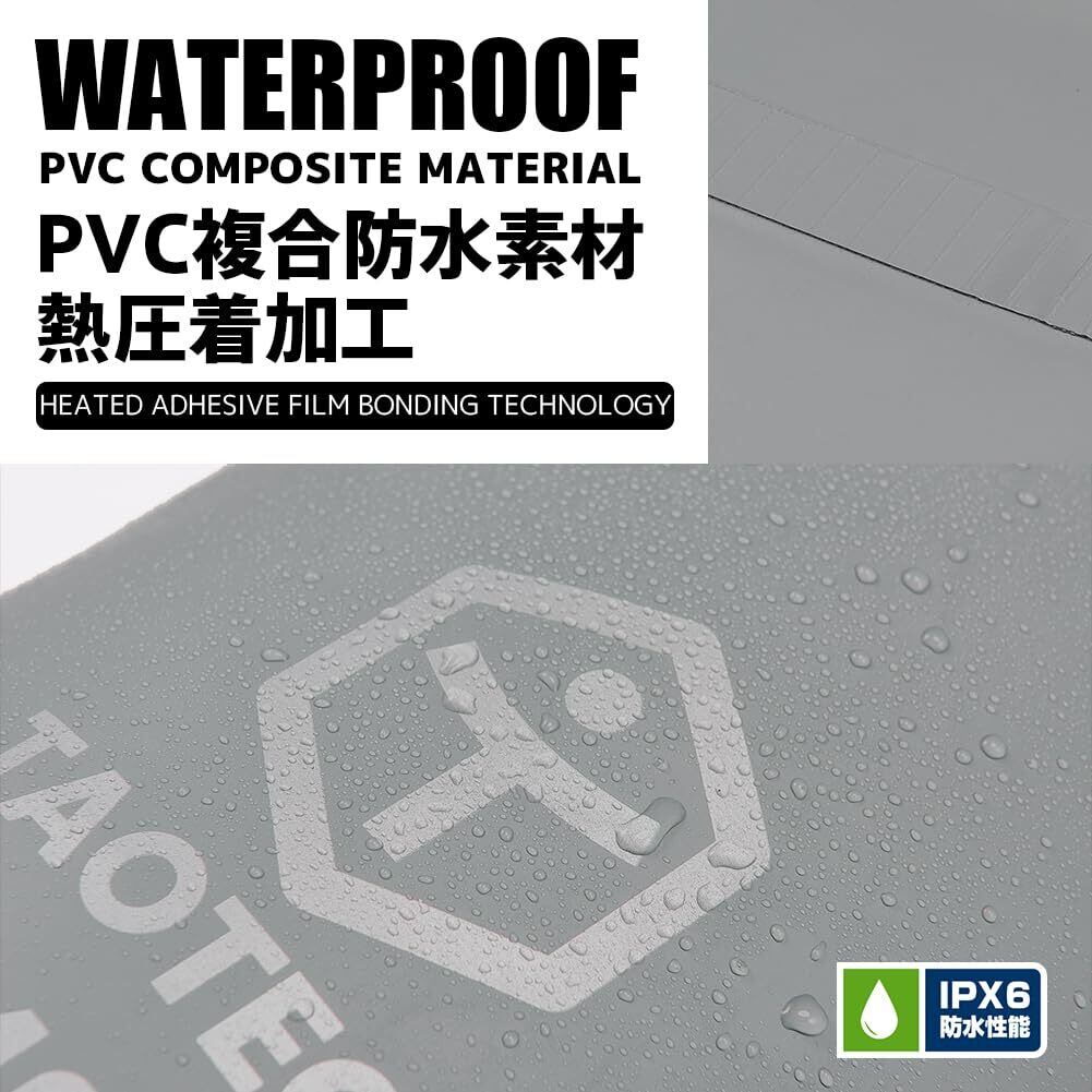 【縫い目なし】高周波熱着圧(ウェルダー)加工により、継ぎ目からの水を侵入防止しています。表面のTaoTechのLoGoは反射材仕様、夜間の使用も安心。