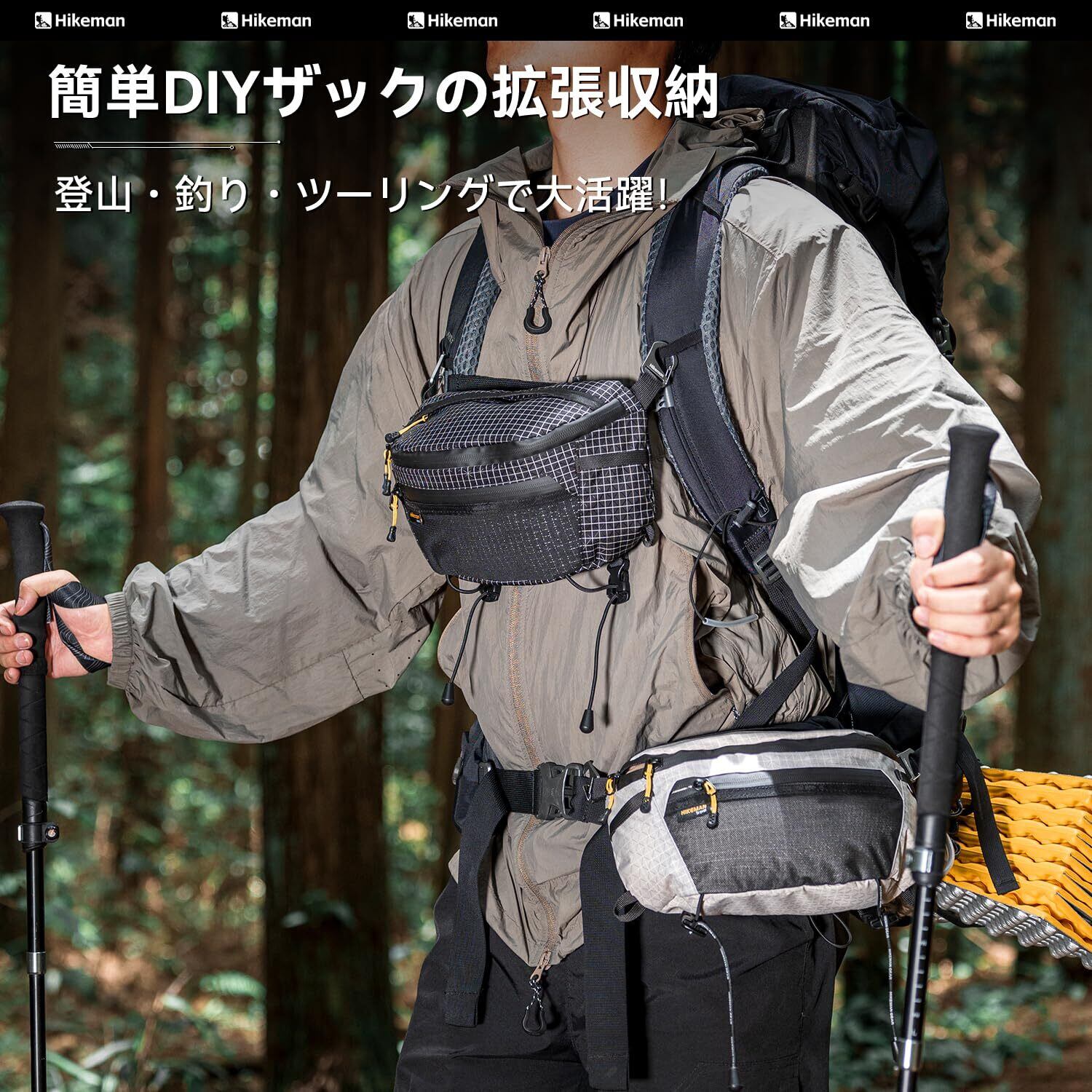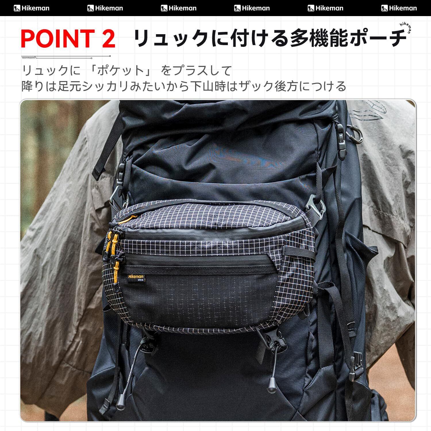 「見た目以上の大容量」:500mlペットボルトも収める大容量ポーチ、そして、底部はストラップも搭載、自撮り棒や折り畳み傘など持ち運びにくい物もしっかりと固定して持ち運べる。クッションのあるメッシュ背面で、通気性に優れ、登山をより快適に楽しめる。
