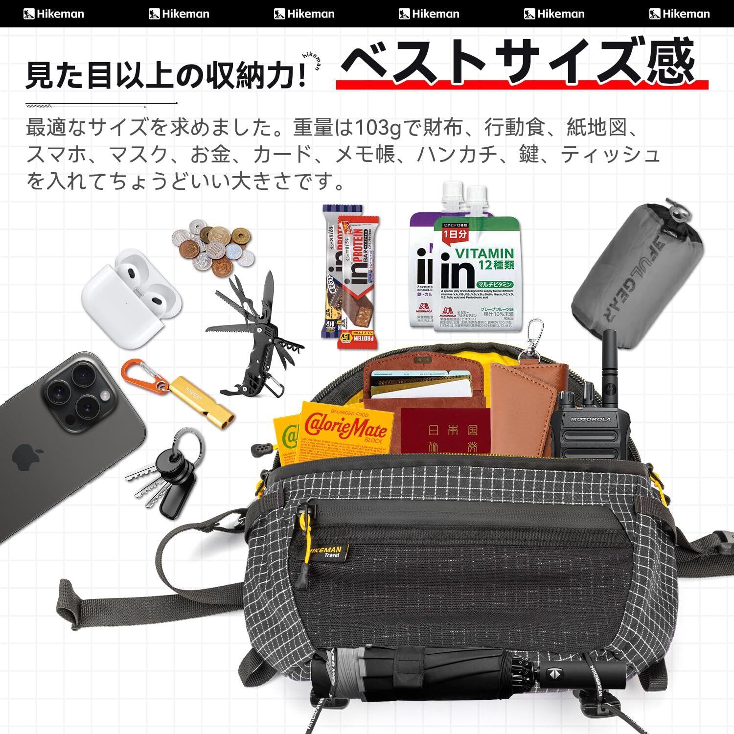 「取り出しやすさに工夫した」:複数ポケット備えた登山用ポーチです。そして広く開閉できる開口部デザイン。鍵や行動食、ハンカチなど分けて収納することが可能。中身が整理しやすく、見やすく、手を入れてゴソゴソ探し回らなくてもざっと物を取り出せます。