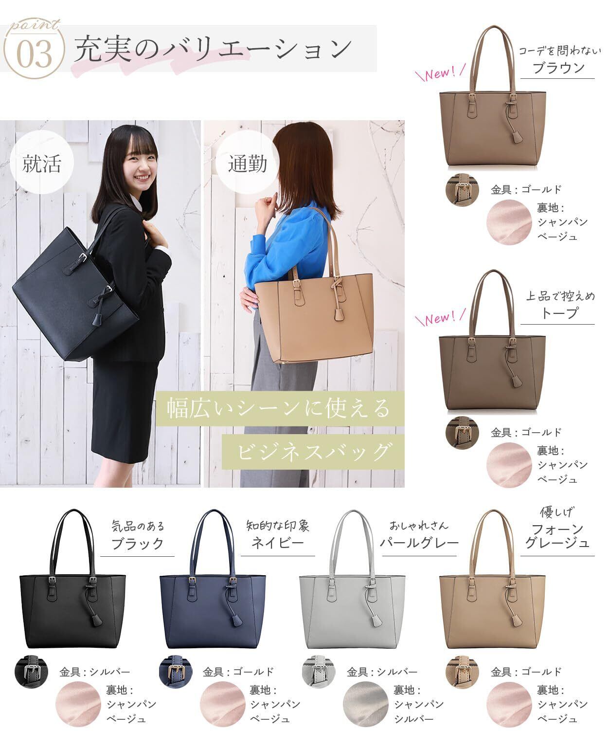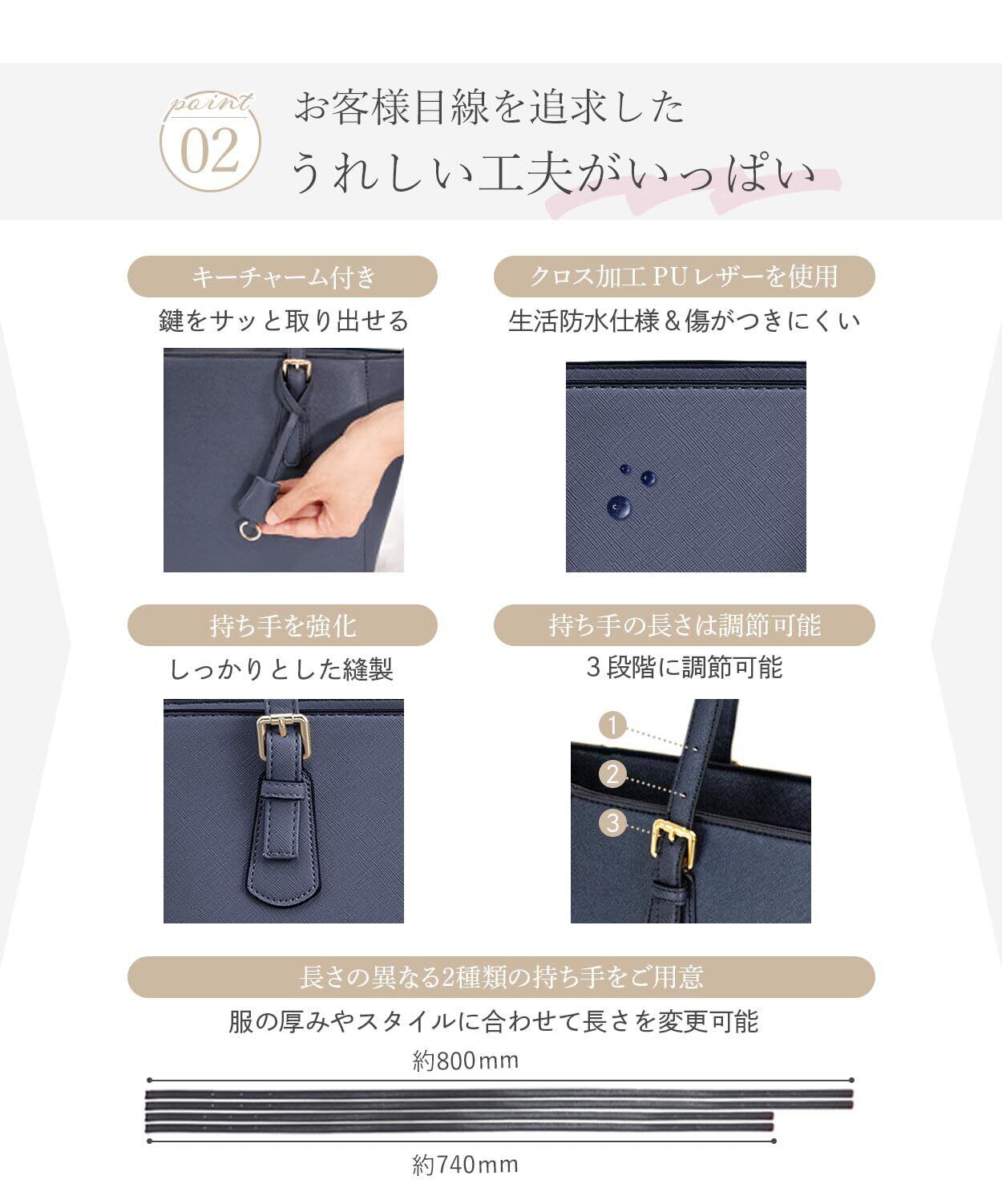 【通勤にも就活にも使える万能デザイン】 シンプルかつ洗練された外観は、ビジネス・就活・フォーマルまで幅広いシーンで活躍。カラーや素材感にもこだわり、ファッション性と実用性を両立させたトートバッグです。