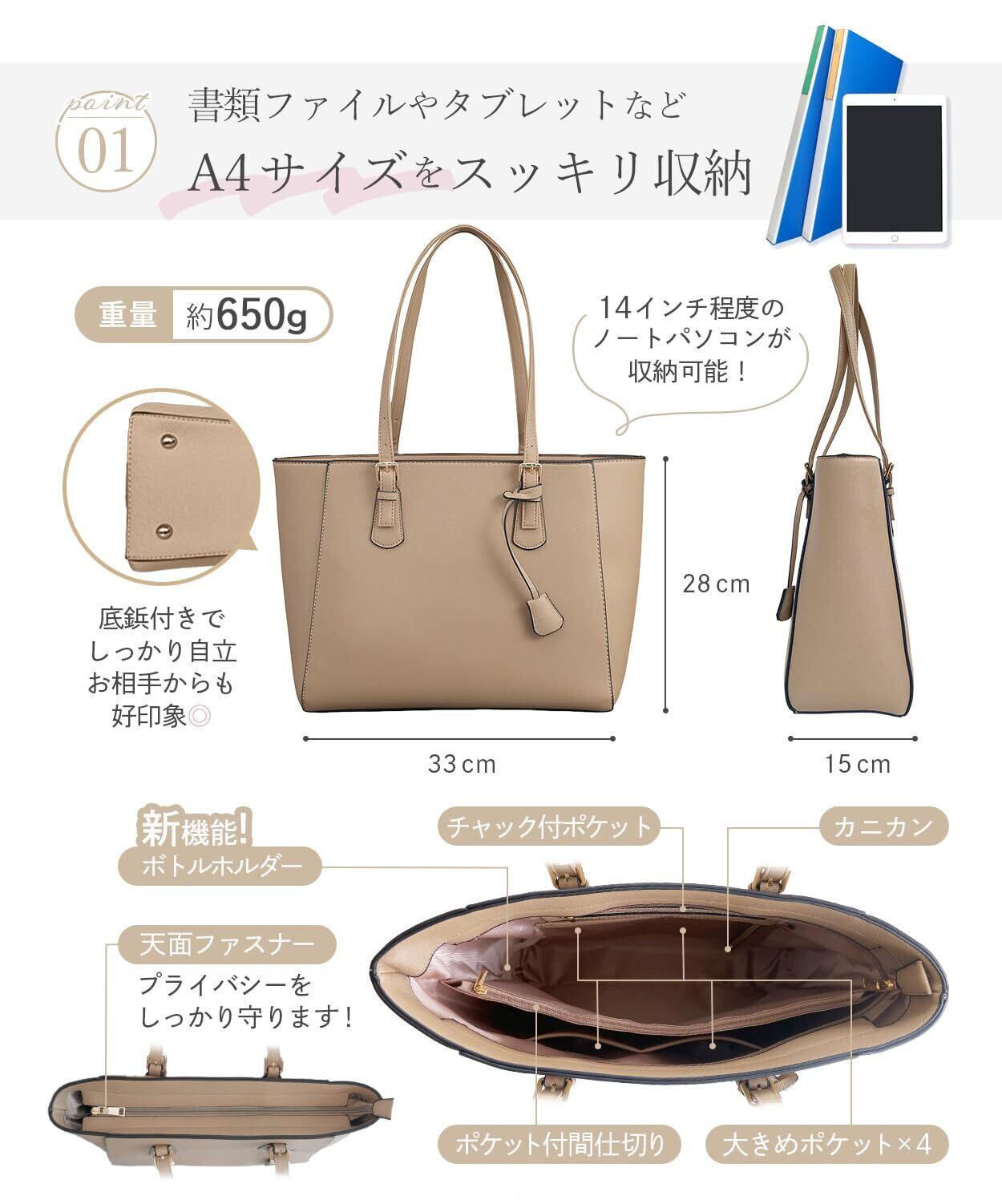 [アンコール] ビジネスバッグ 通勤バッグ 【収納のプロ監修 美フォルム梱包】 レディース トートバッグ 通勤 かばん 撥水 A4 自立 大容量 肩掛け 就活 リクルート 面接 バック