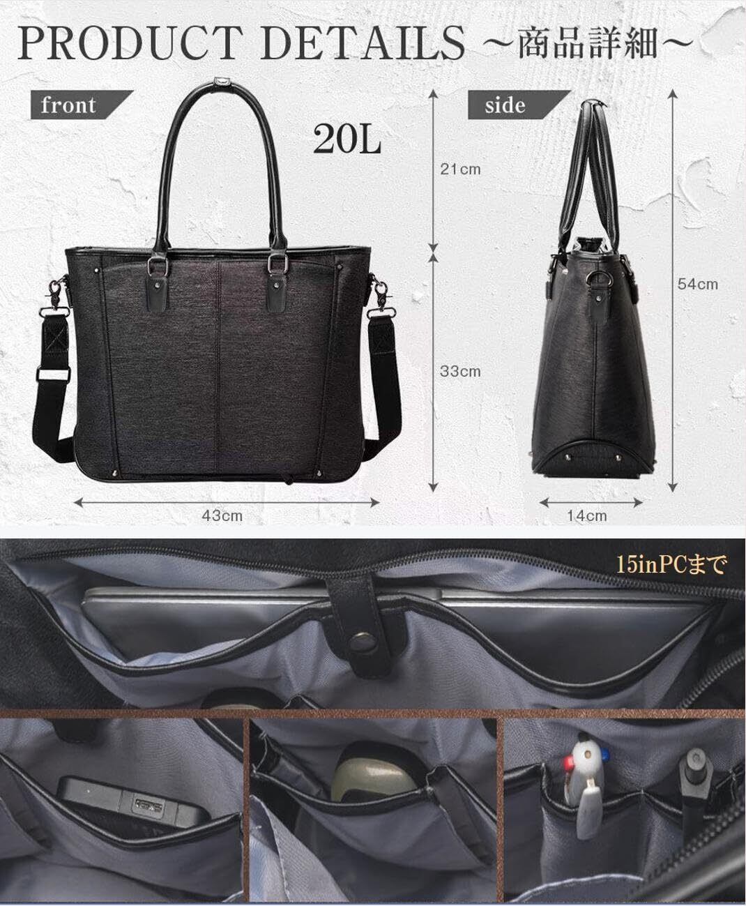 【特徴3】両面あおりポケット仕様。通常バッグは裏目に収納層がないことに比べ、両面あおりポケットが設けているので収納性、利便性がアップ、大超量かつ軽量のため様々な場面で使えます。【特徴4】メイン生地はナイロン製モクブラック生地となり、エレガントな雰囲気を実現。毎日の通勤でもおしゃれに使用できます。
