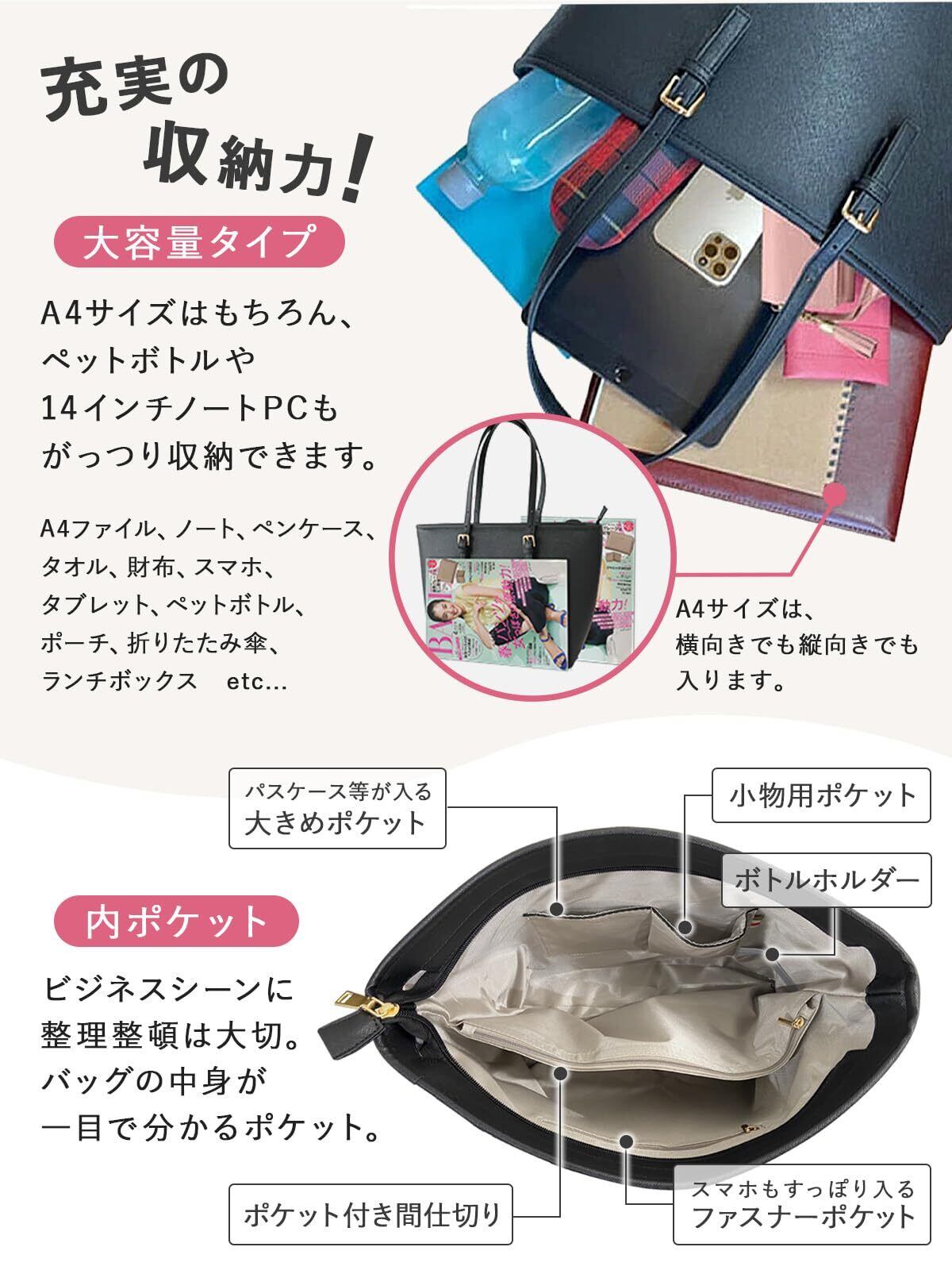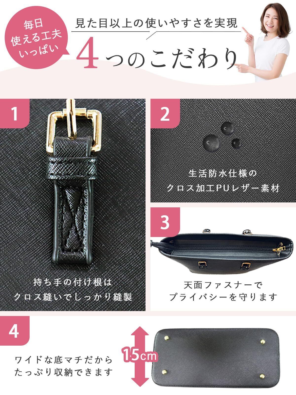 【A4対応・自立・防水|機能性を追求した設計】 A4書類やファイルがゆったり入る大容量設計。内部は仕切りポケット付きで整理しやすく、底面広めの自立仕様。さらに生活防水対応で急な雨でも安心です。クロス加工PUレザー素材で上品な印象と耐久性を両立しています。