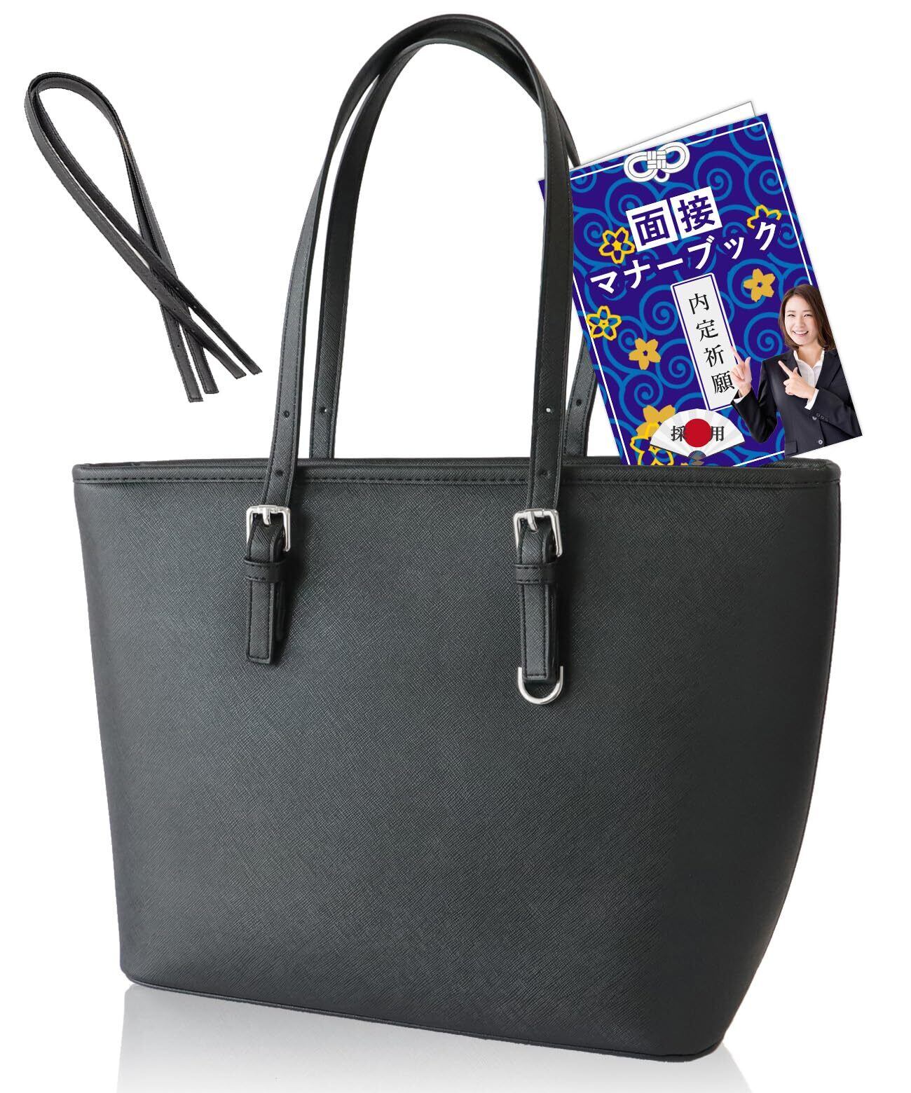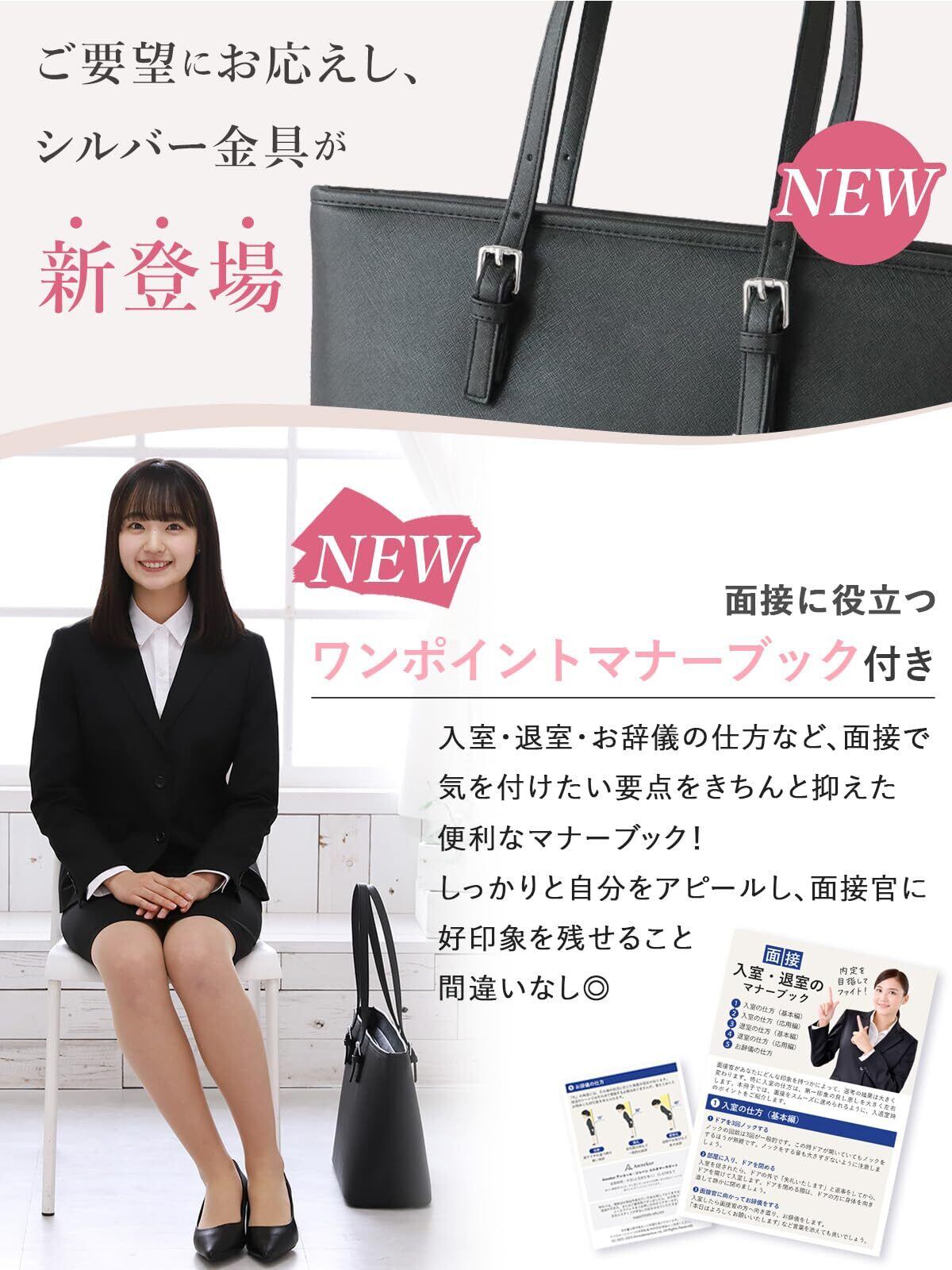 【就活・面接に|マナーブック付きで印象アップ】 面接や説明会で好印象を与えるための入退室マナーをまとめた面接マナーブック付き。初めての就活・転職活動を少しでもサポートできればという思いからご用意しました。バッグと一緒に心構えも整え、内定へと一歩近づける一冊です。