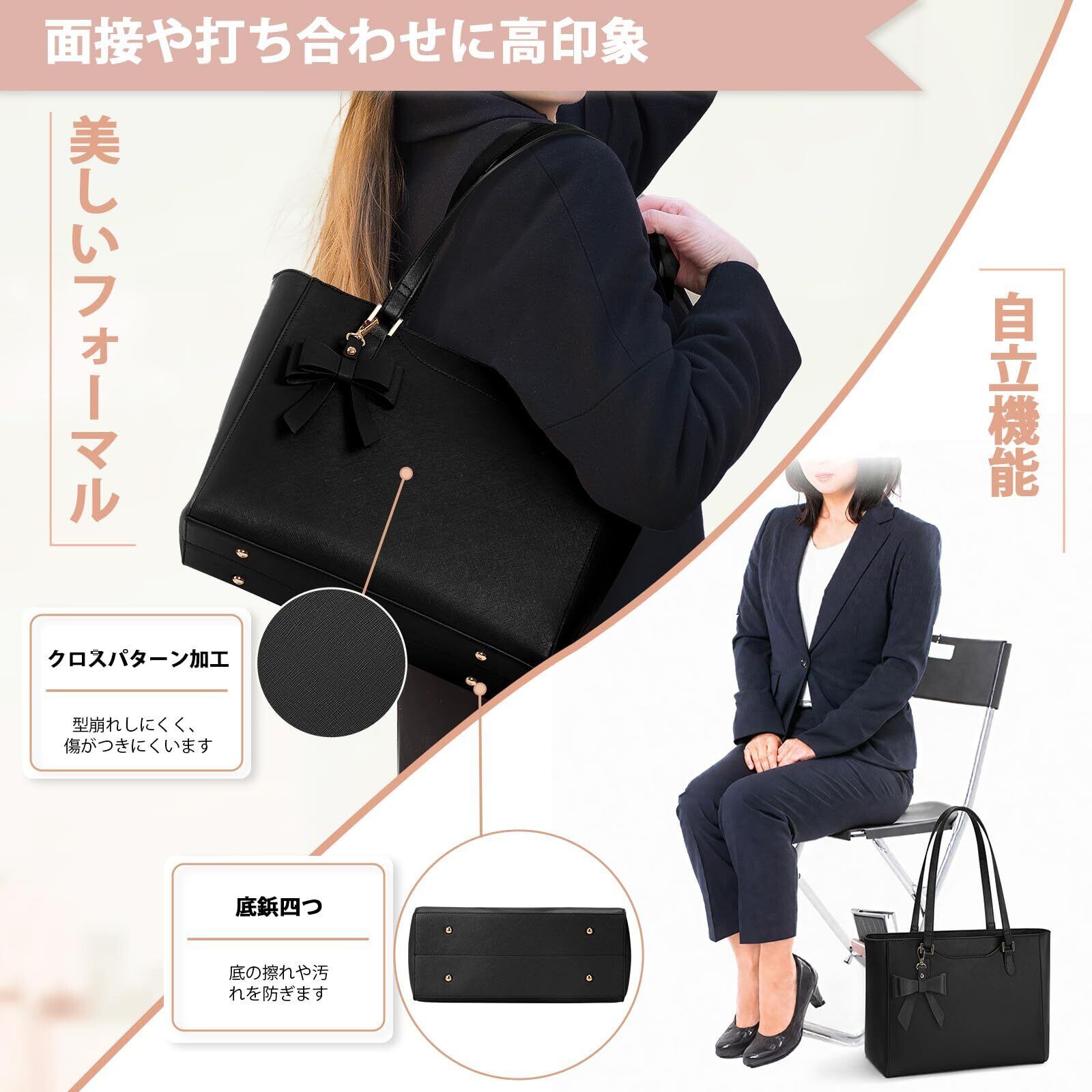 [KTMOUW] ビジネスバッグ レディース 大容量 リクルートバッグ A4 トートバッグ 通勤バッグ 撥水加工 自立 PUレザー 就活バッグ レディースバッグ カバン 鞄 通学 就職 面接 黒