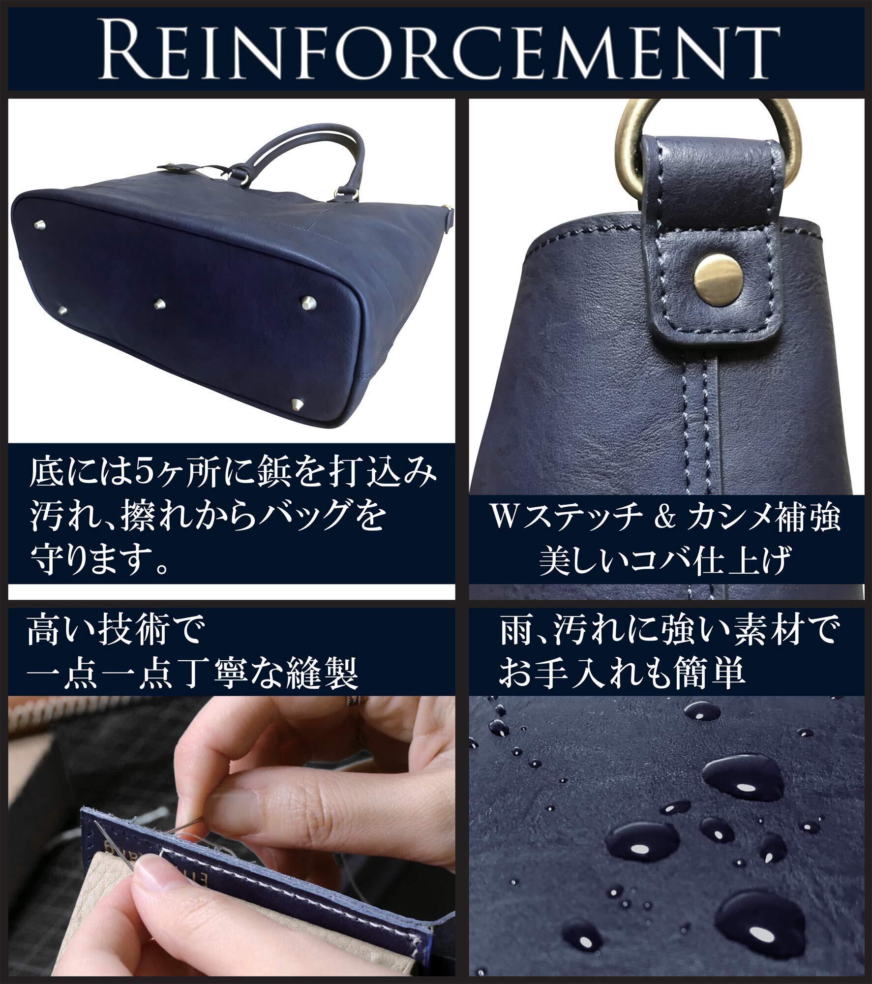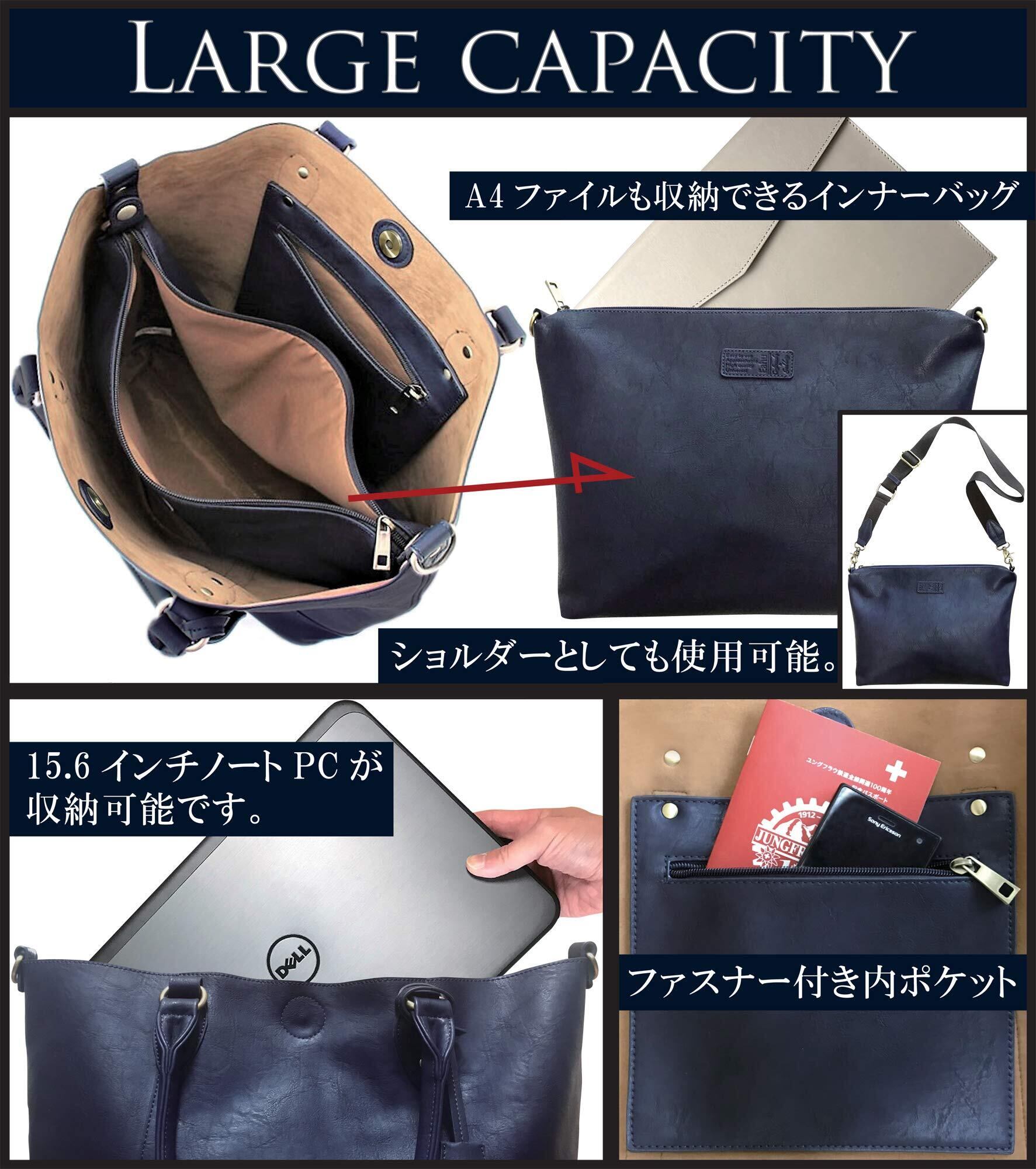 【型崩れ防止】底マチ部分の内部を底板で補強する事により重い荷物を入れても型崩れを起こしません。又、バッグを汚れや傷から保護する底鋲が5ヶ所に付いています。【PCタブレット収納】15.6インチノートPC、 タブレット収納が可能です。(バッグインバッグにはA4ファイルサイズが収納可能です。