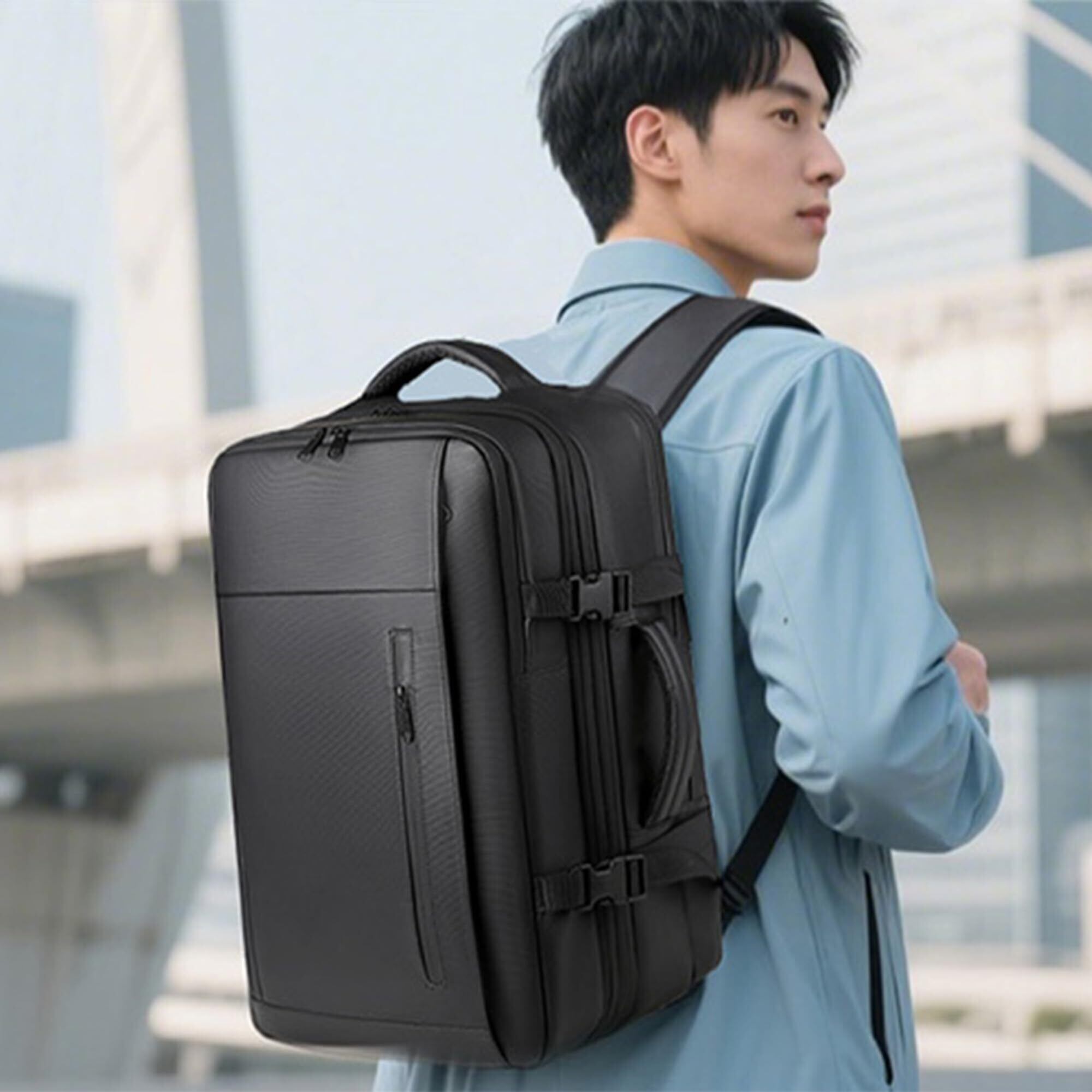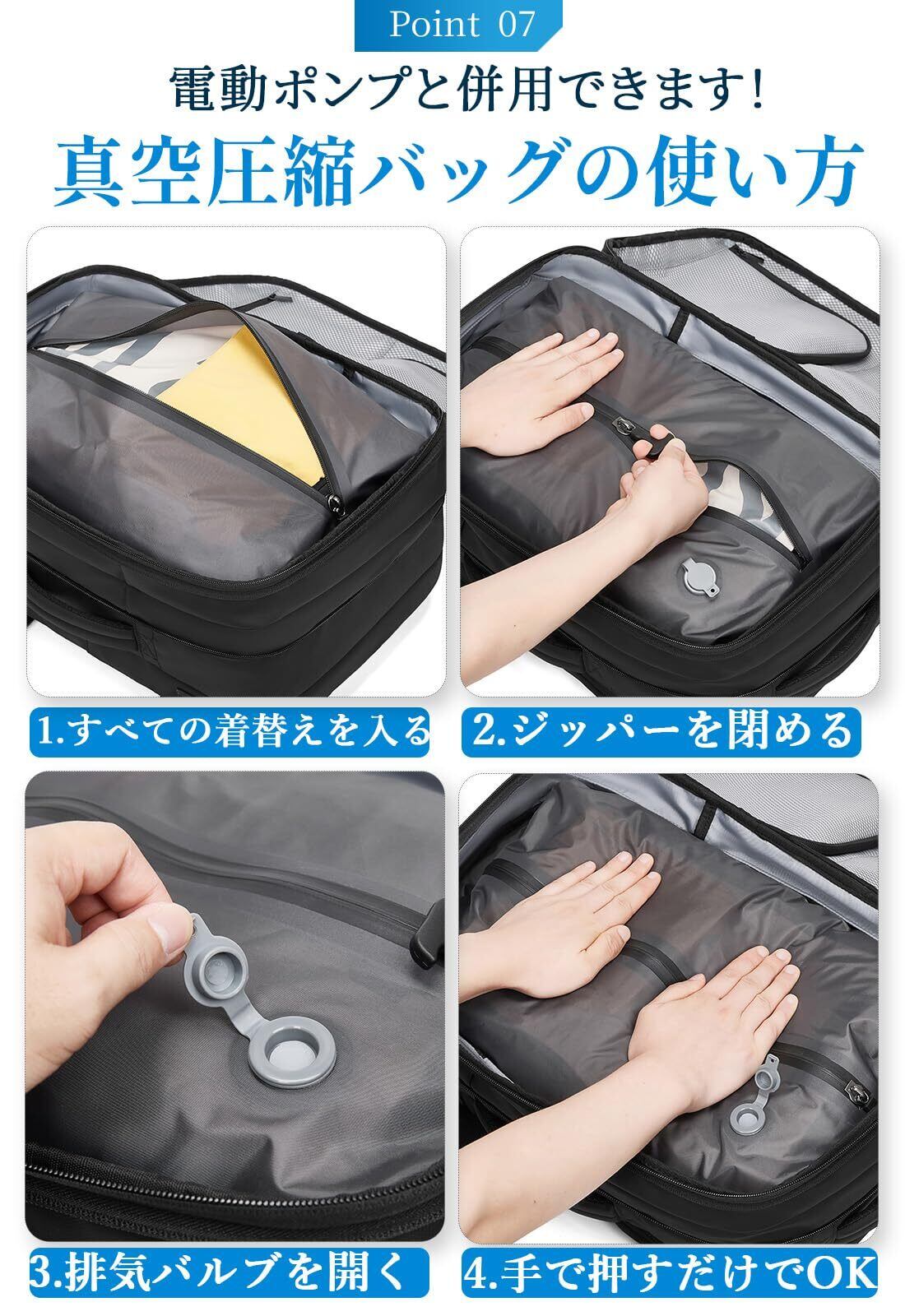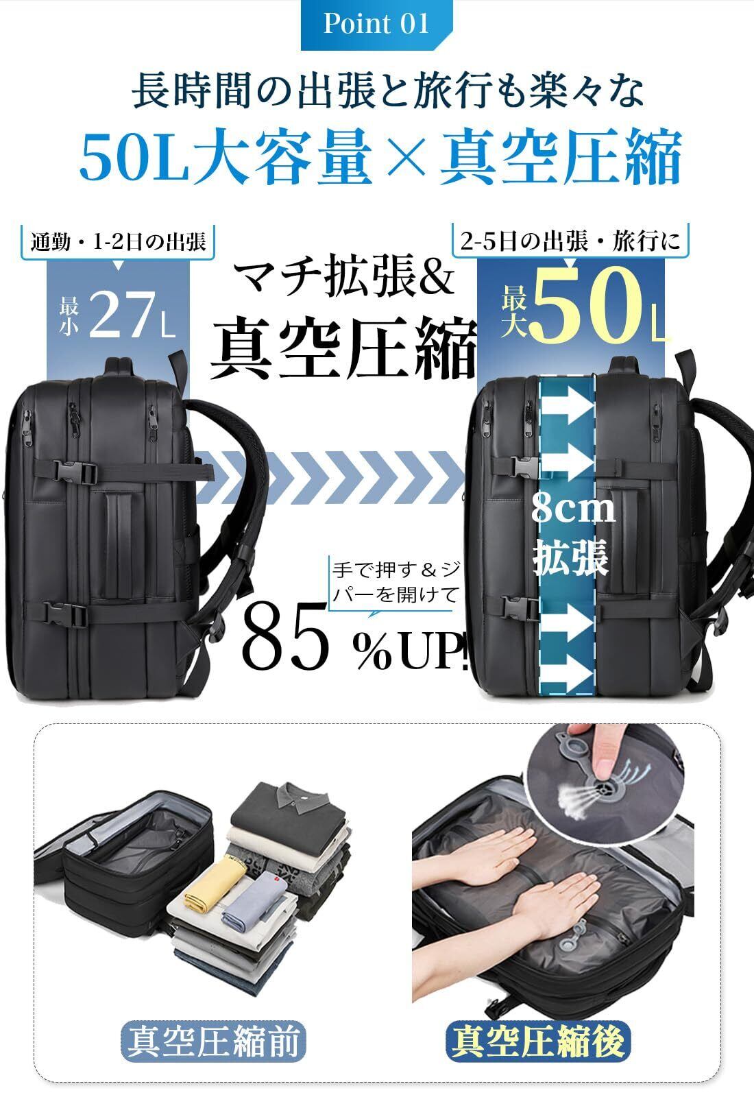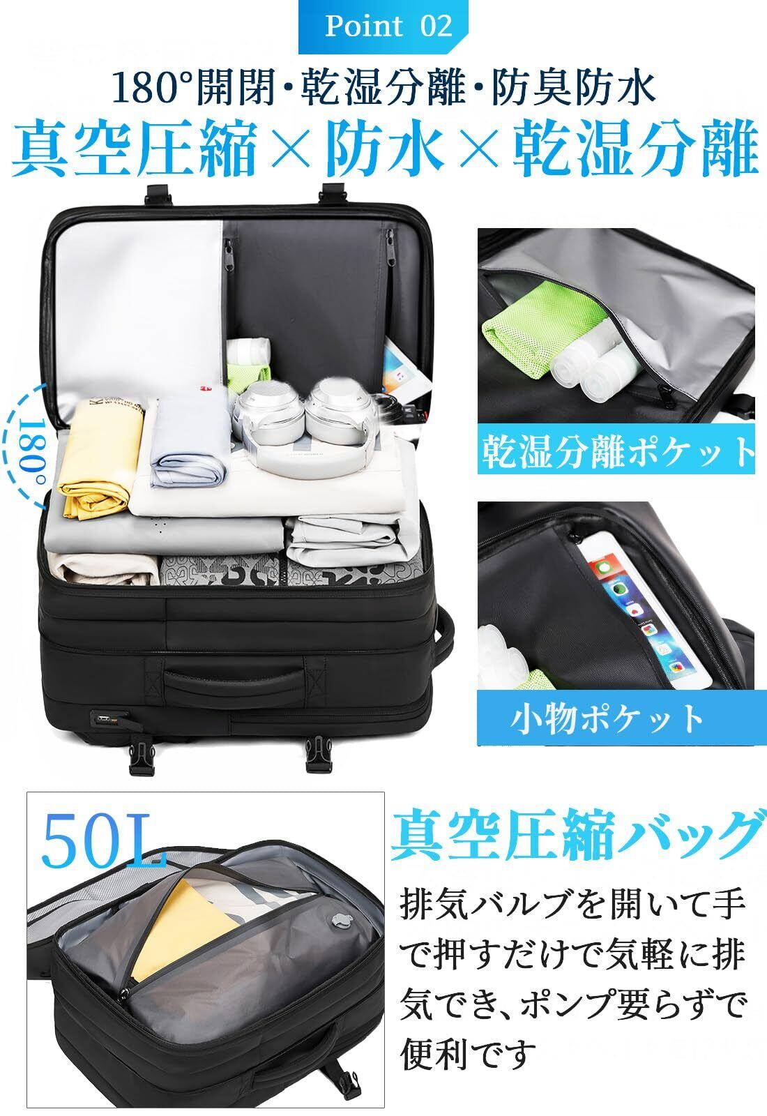 【真空圧縮バッグ付き】リュックの内に真空圧縮ポケットがあり、50リットルの荷物でも省スペースに収納できます。排気バルブを開いて手で押すだけで、かさばりやすい衣類を圧縮して収納でき、3日~5日の出張と旅行もこれ一つだけで楽々!特に、長時間の出張や旅行の中に託送免除が可能ですので便利です