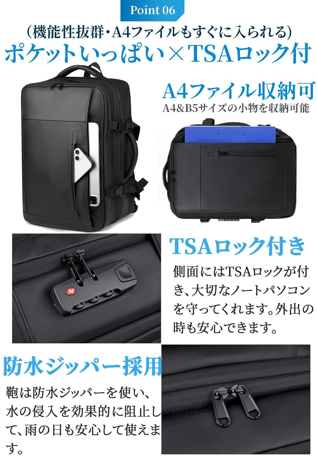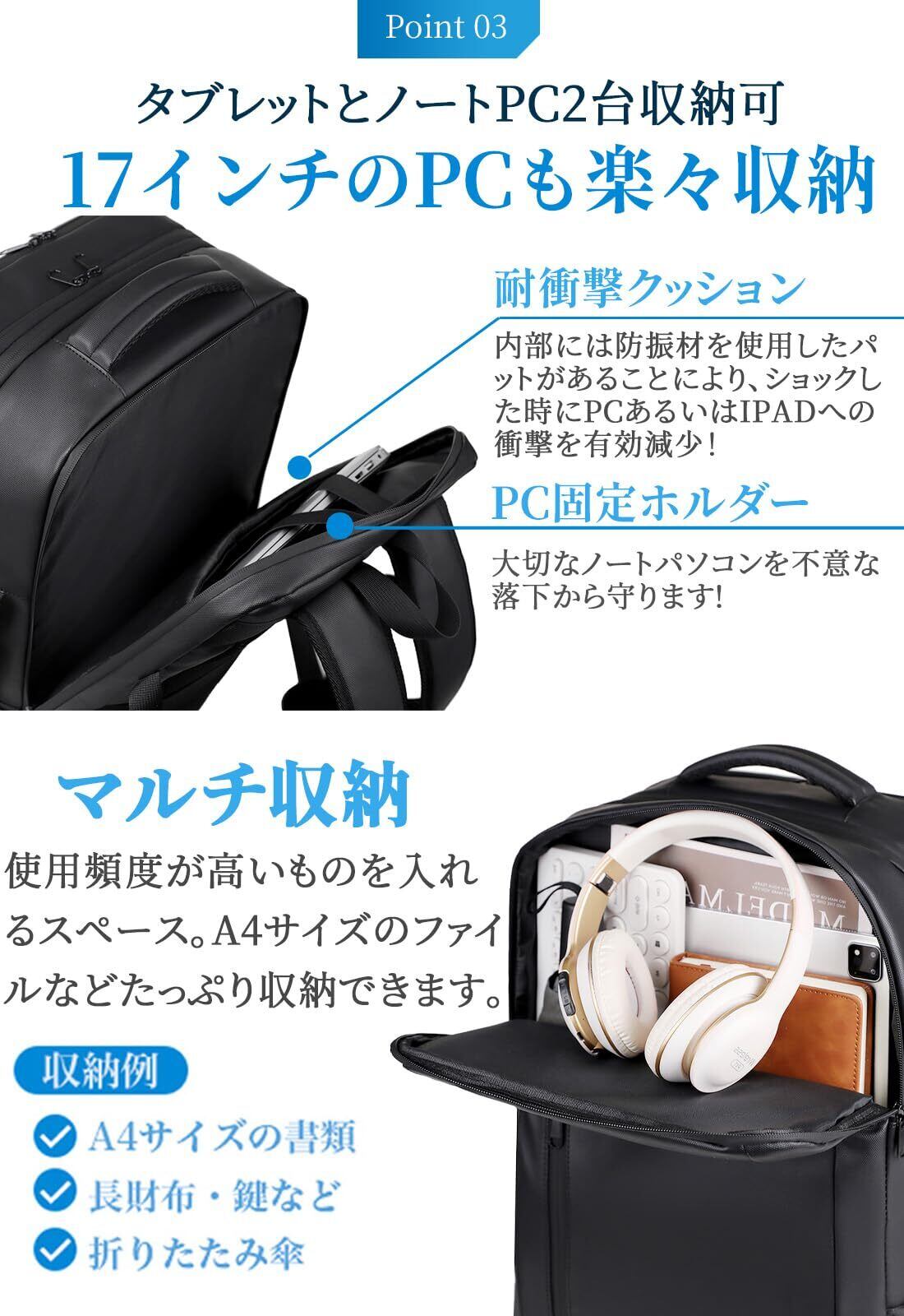 【50L大容量・マチ拡張】サイズ:45*30*20cm(マチ拡張前:約27L)/45*30*28cm(マチ拡張&真空圧縮後:50L);17インチノートパソコン、A4サイズの書類やファイル、3~5日分の衣類等もたくさん入るので、出張や旅行に便利なビジネスリュック。【トランク収納】乾湿分類ポケット付きで、3~5日分の衣類と、濡れたものを分けて収納できるので出張や旅行に重宝できます。【デバイス収納】パソコンや書類入れるのに最適なスペース。17インチのPCも楽々収納でき、縦横どちらからも取り出しやすい仕様です。 【マルチ収納】使用頻度が高いものを入れるスペース、防水ファスナー採用。 【盗難防止ポケット】背面には、デイリーに使う携帯やお財布等の貴重品が出し入れしやすいポケット付きです。