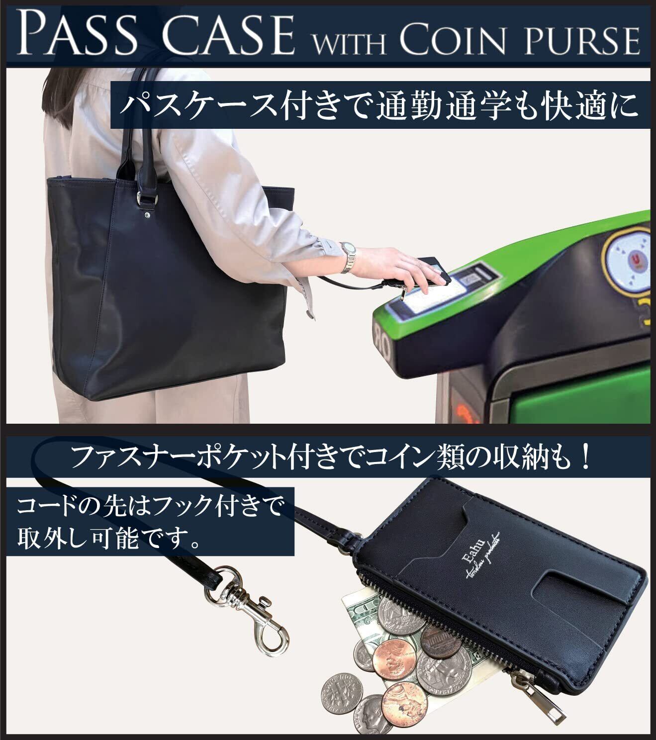 【安心保証】Eahuの商品には全て返金・返品保証が付いております。お買上げ頂いた商品を手にしてみて、お色やサイズ感などお気に召さなかった場合でものガイドラインに従い到着後30日間は無料で返品交換等の対応を承っておりますのでご安心してお買い求め下さい。【完全自立型】トートバッグに荷物が入っていない状態でも自立します。【パスケース付き】取外し可能なパスケースが付属しています。パスケースにはファスナーポケットが付いており小銭や切符などの小物の収納が可能です。