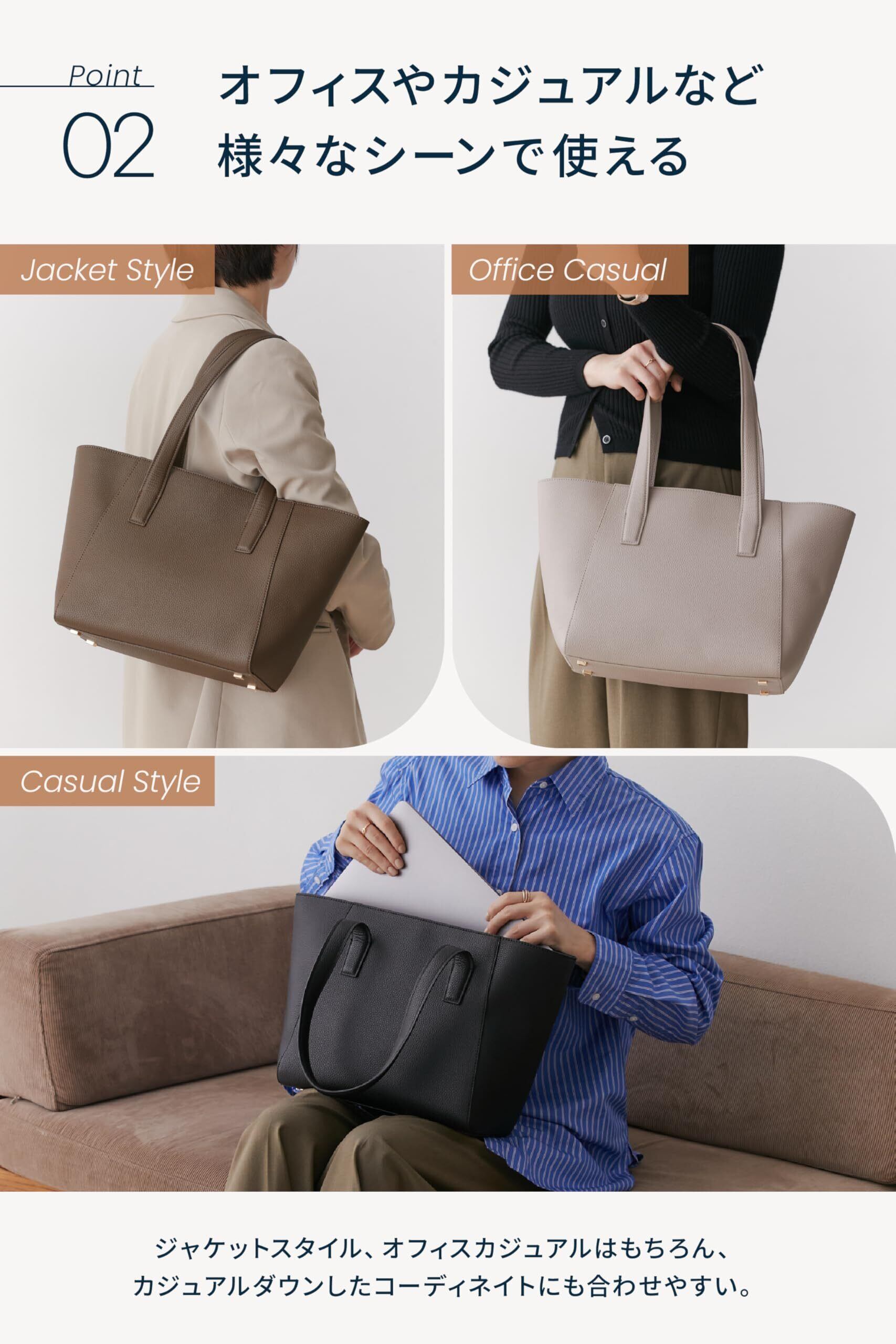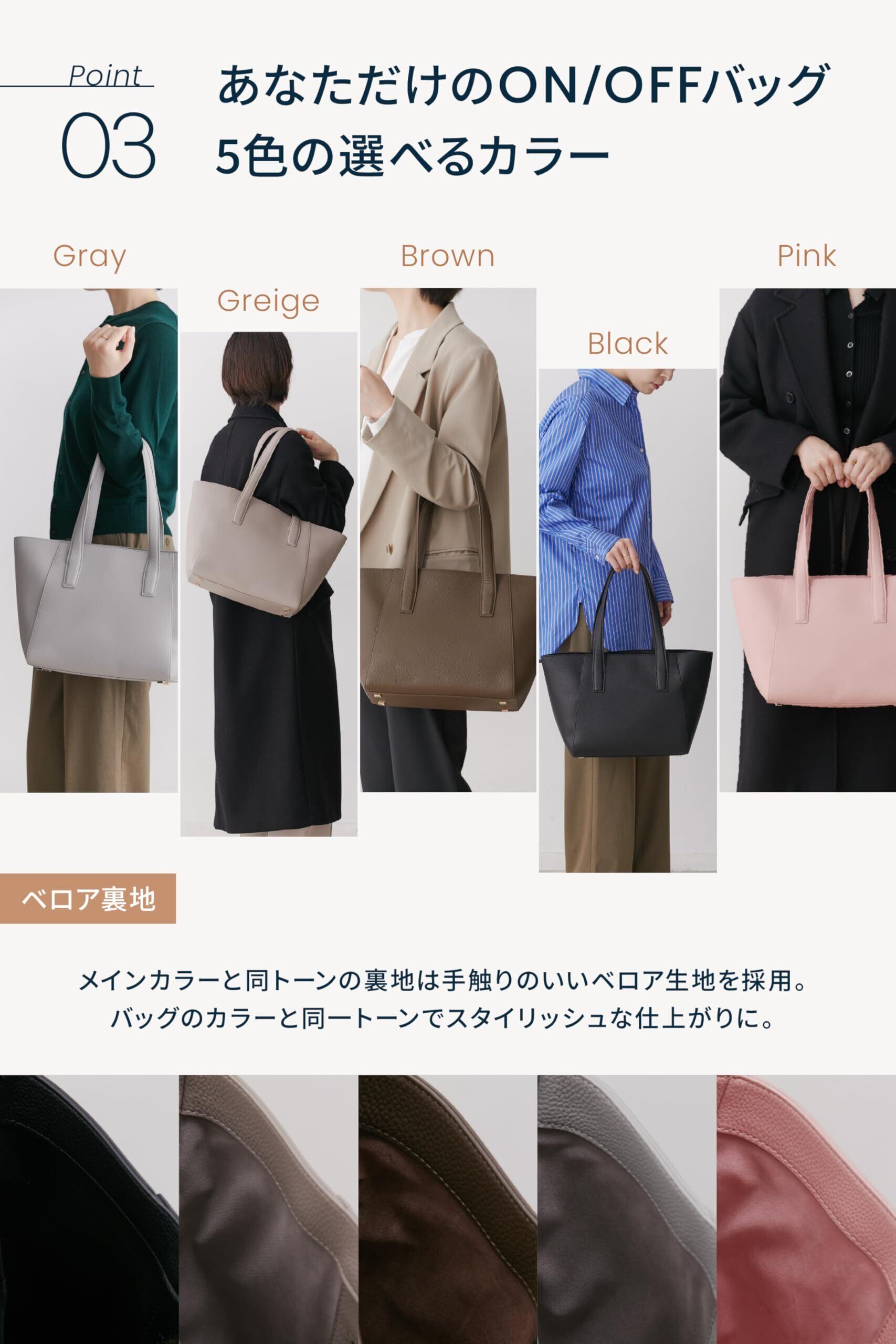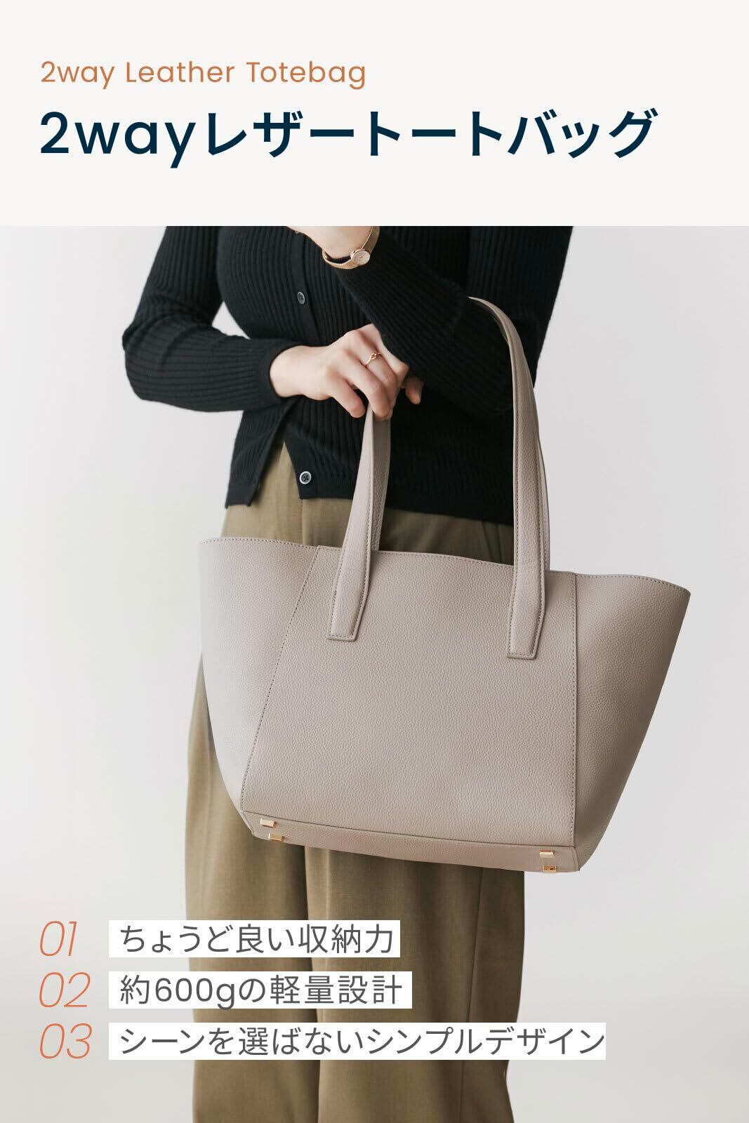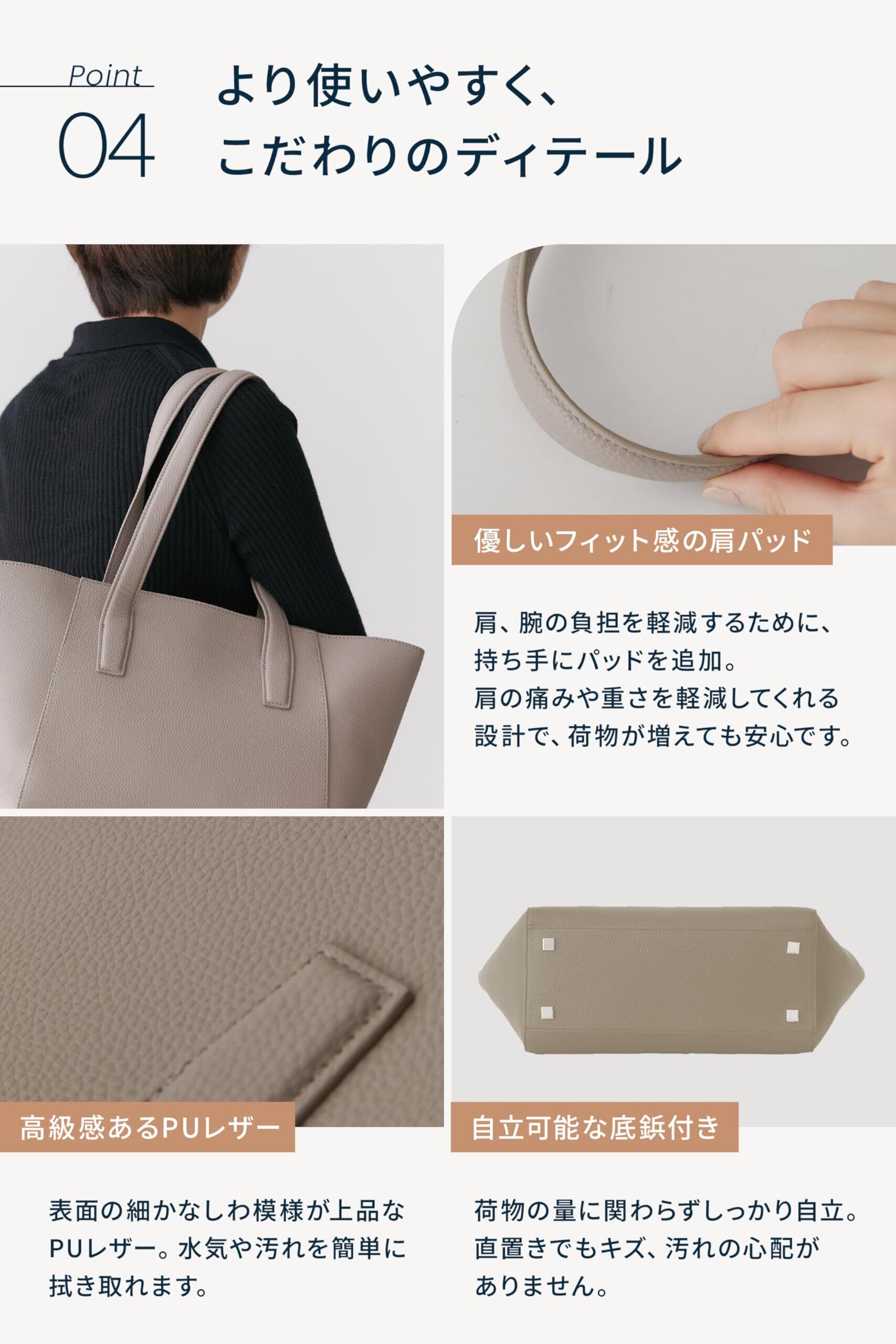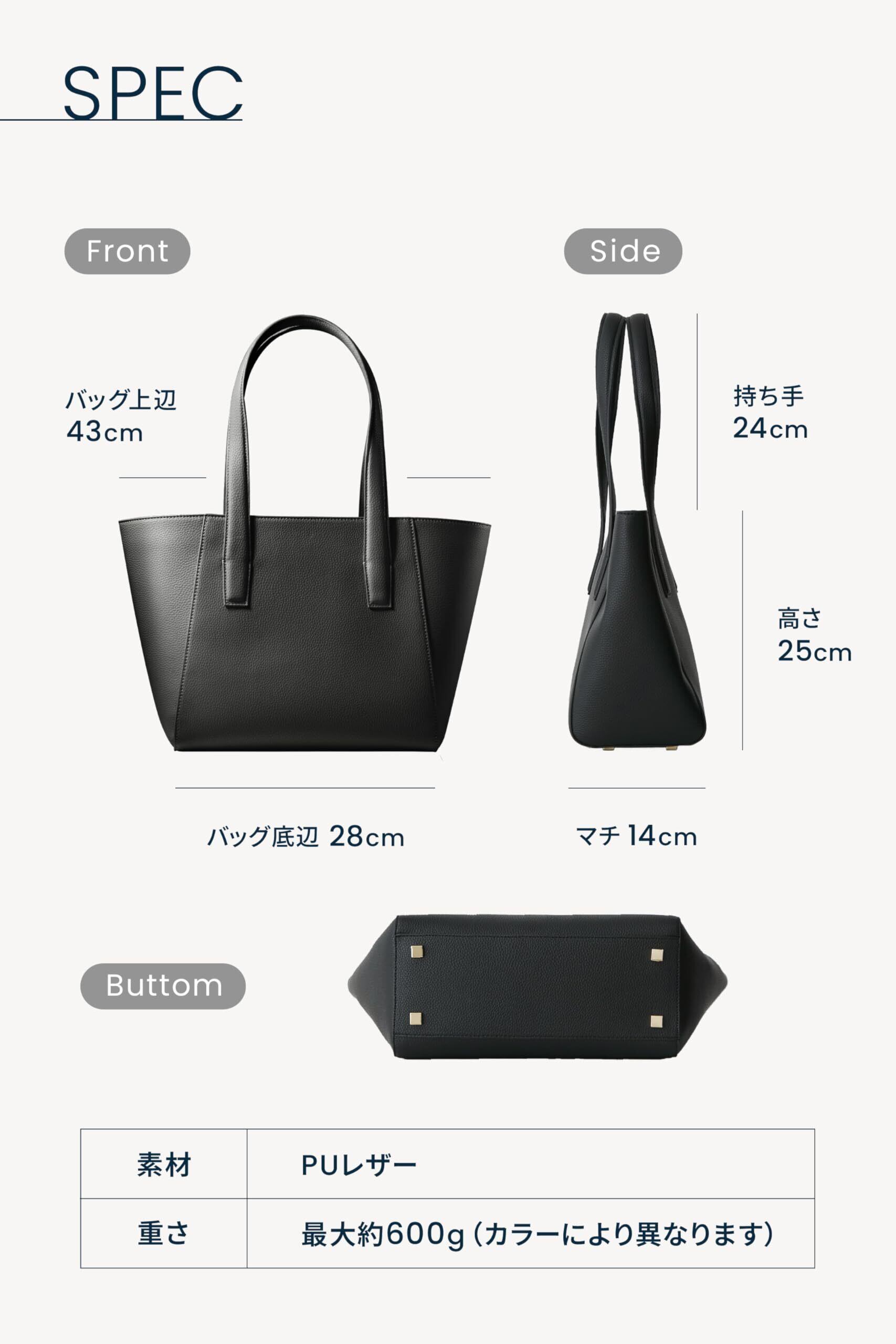 上品で高級感のあるトートバッグです。PUレザー製のため、軽い使い心地とお手入れのしやすさも嬉しいポイントです。オンでもオフでも使い勝手がよく、全5色からお選びいただけます。