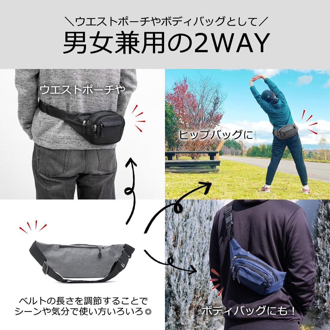 【2way仕様】ベルトを短くしてウエストポーチに。長くすればボディバッグに。身体にフィットするシンプルなデザインで、旅先でのサブバッグとしても。サイクリングやハイキング、釣り、山登りに旅行、街歩き等など男女問わず装着でき、普段使いにも作業用にも大活躍!!