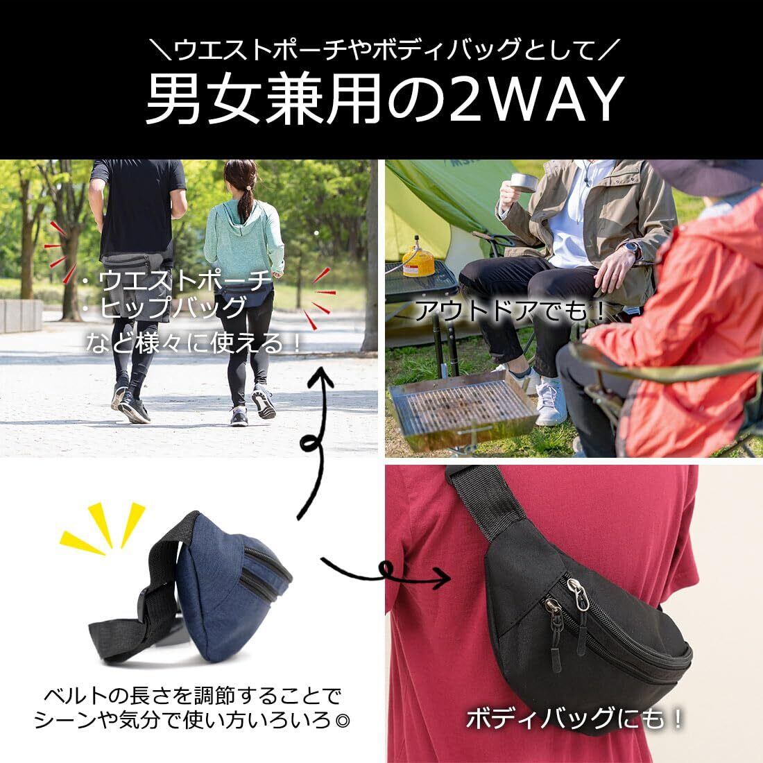 【2way仕様】ベルトを短くしてウエストポーチに。長くすればボディバッグに。身体にフィットするシンプルなデザインで、旅先でのサブバッグとしても。サイクリングやハイキング、釣り、山登りに旅行、街歩き等など男女問わず装着でき、普段使いにも作業用にも大活躍!!