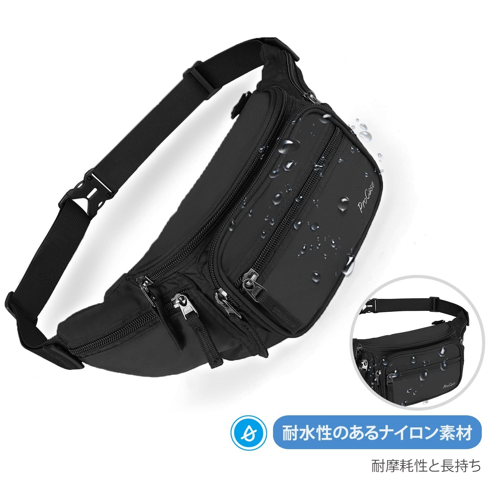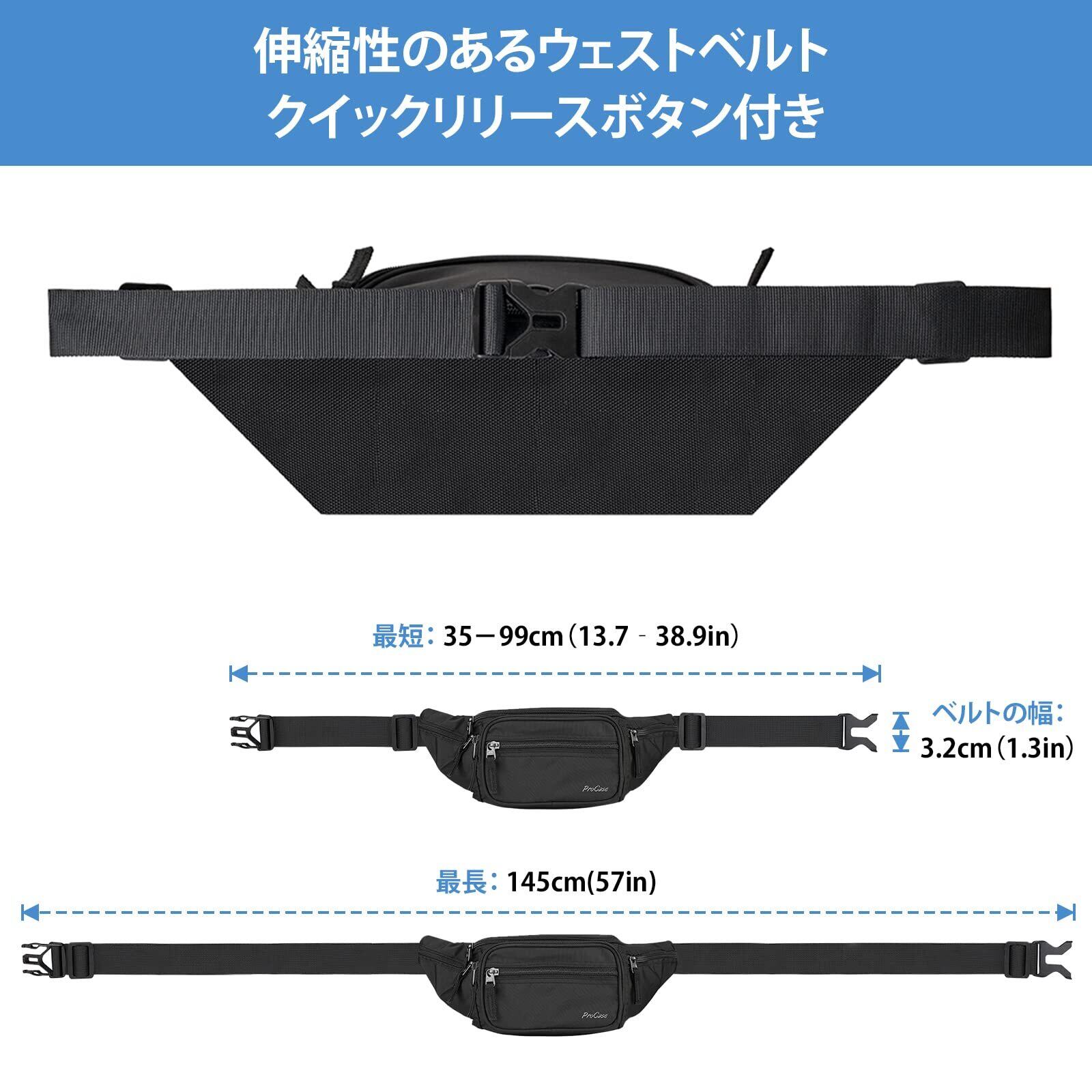 ProCase ウエストポーチ ウエストバッグ 調節可なウエストバンド 6個ポケット メンズ レディース 仕事用 バイク用 耐水性 大容量 ipone/Airpodsなど収納可能 財布 適用場所:旅行 ハイキング ランニング アウトドア- ブラック