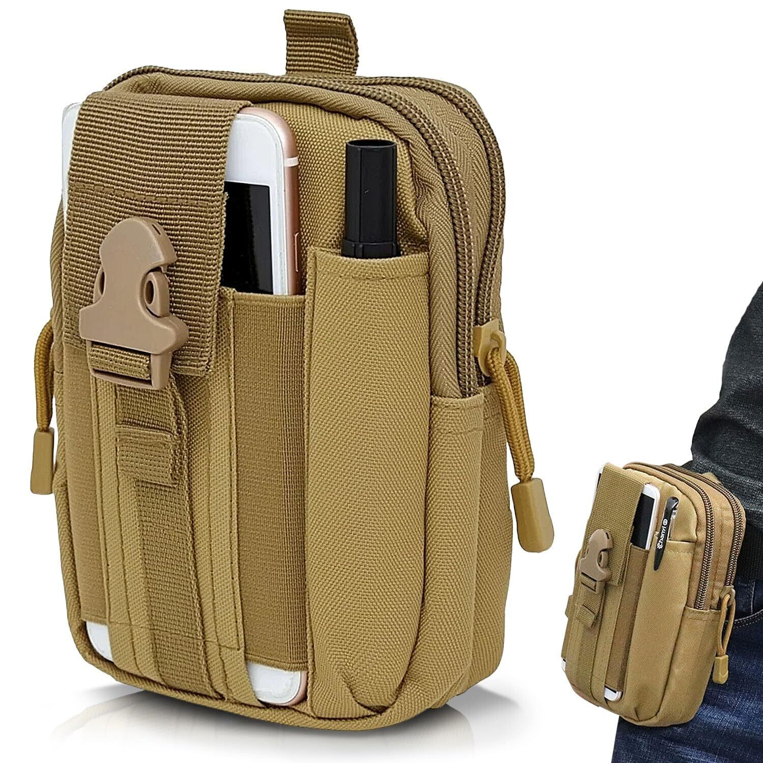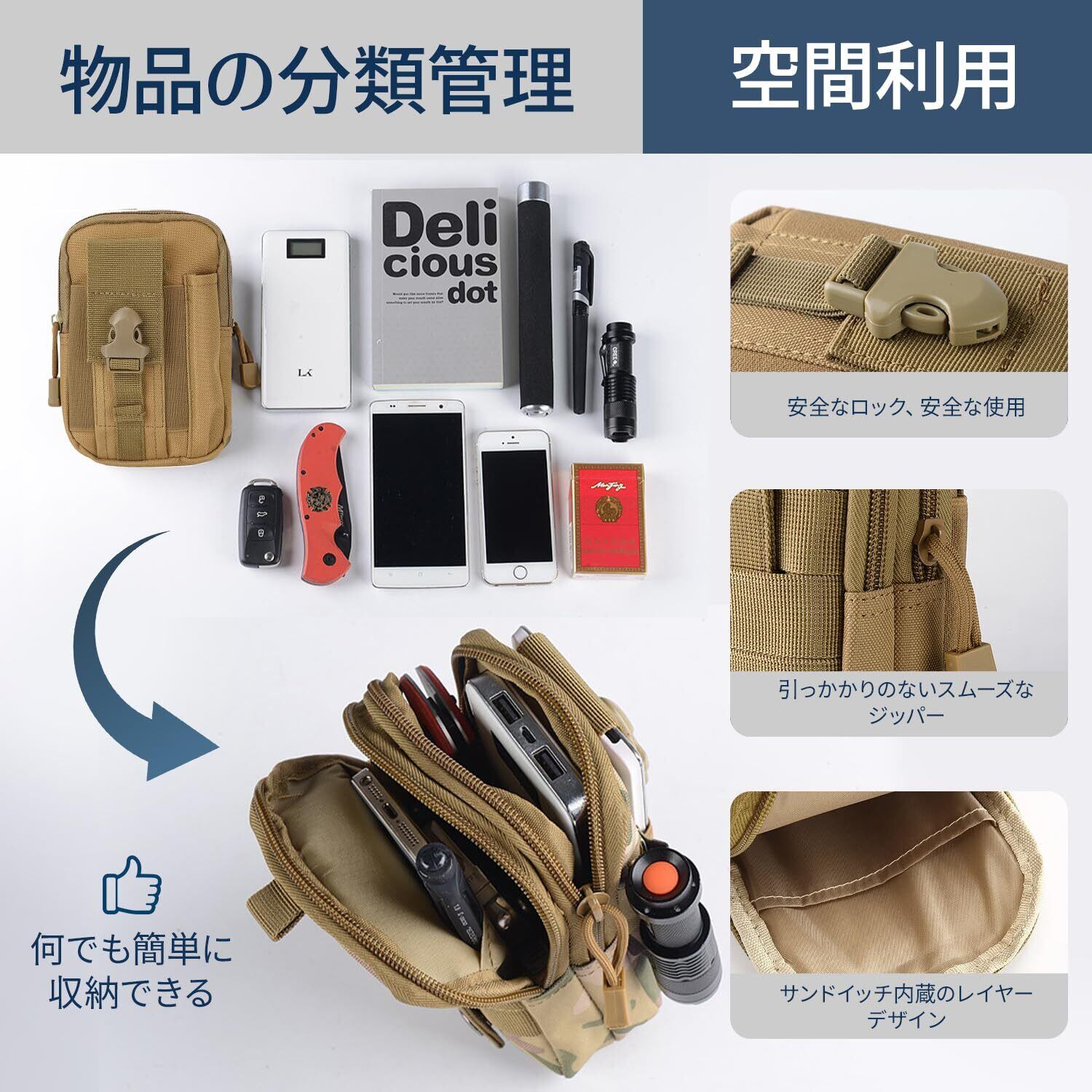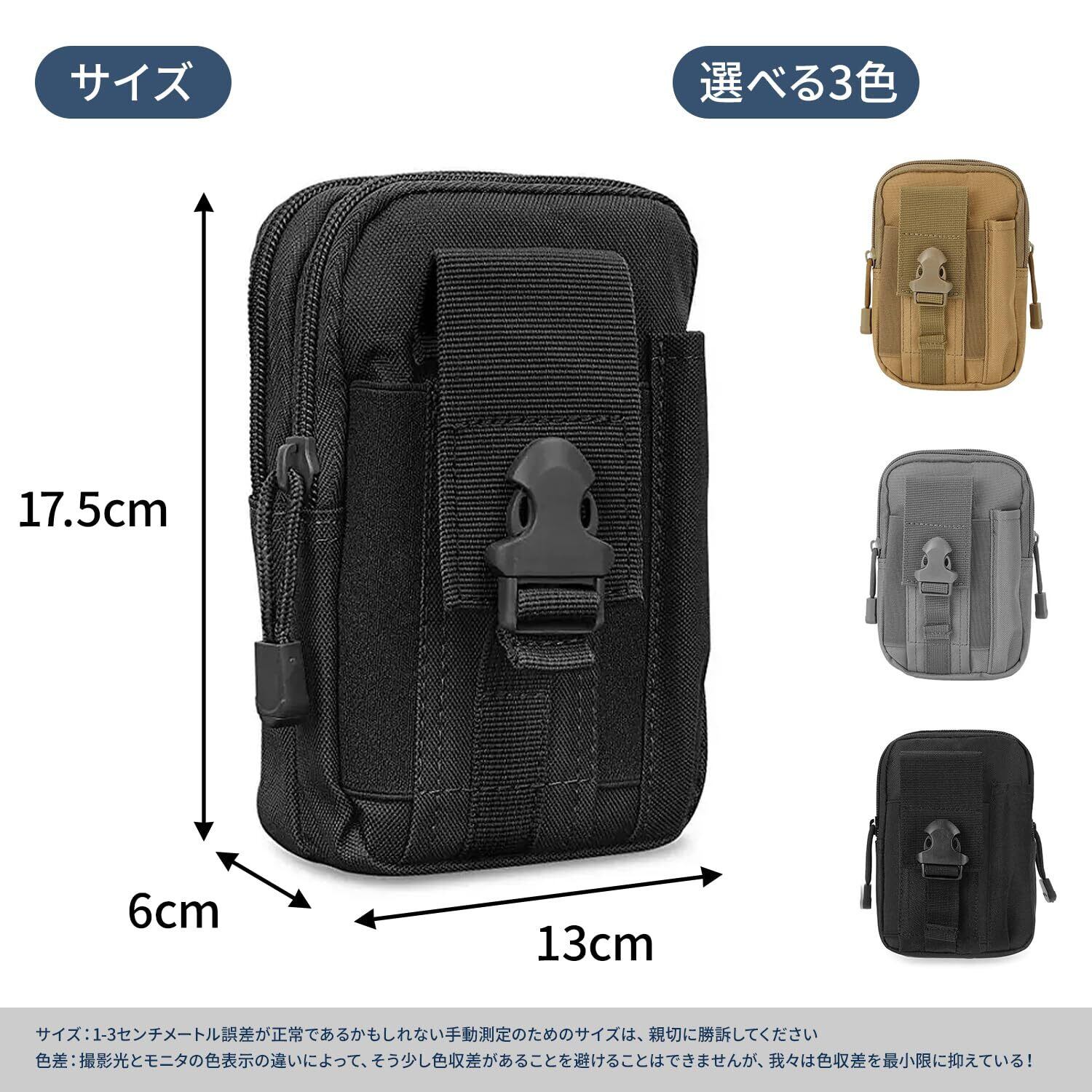 ✨【多機能デザイン】カラー:ブラック/グレー/カーキの3色展開。17.5×12×6cm。小物を分類収納できるベルトポーチ。開口部が広く、出し入れが簡単で、日常使いからアウトドアまで便利です。