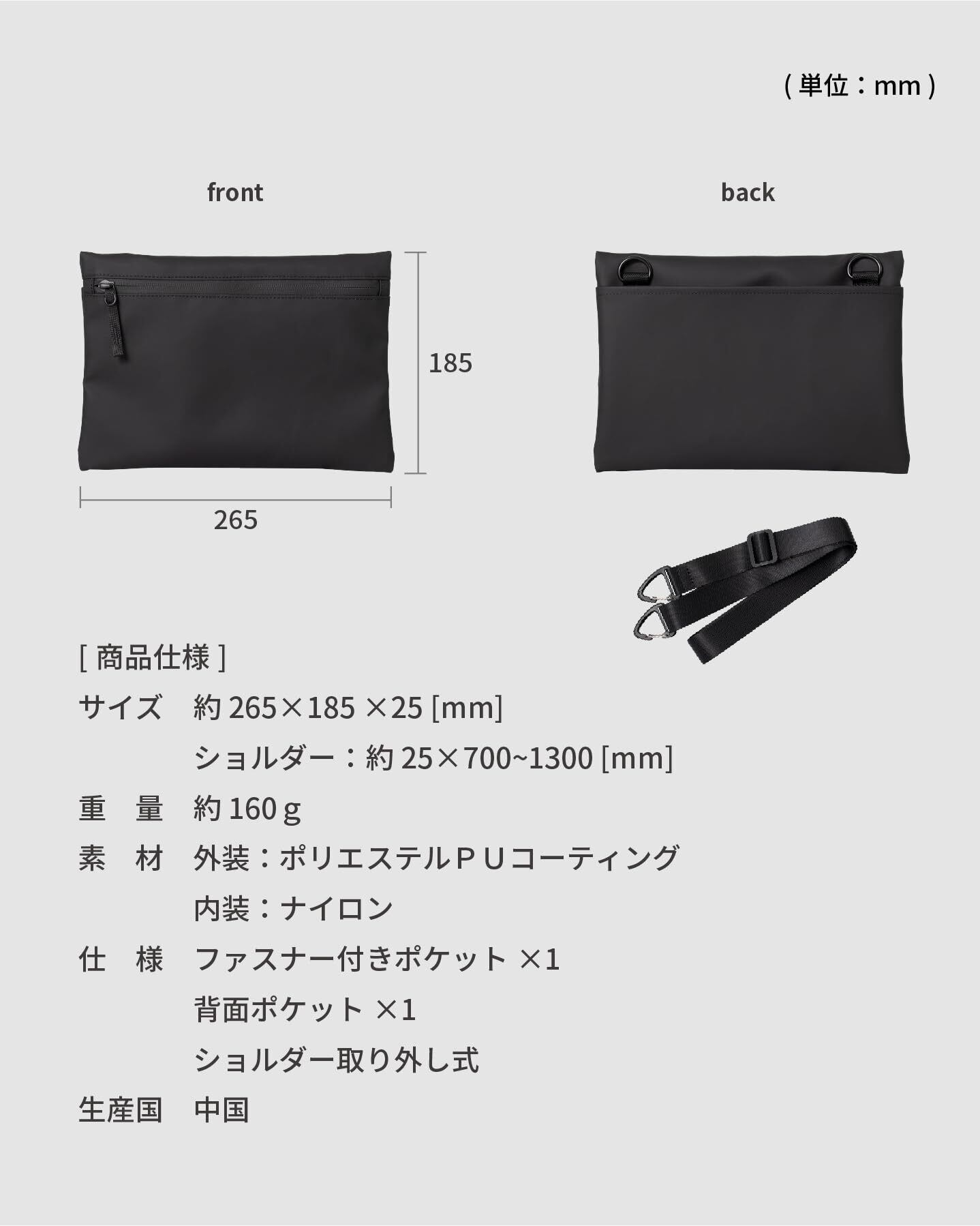 【サイズ】約265×185×25mm、ショルダー約25×700~1300mm 【重量】約160g 【素材】外装:ポリエステルPUコーティング 内装:ナイロン 【対応機種】iPad mini(専用スリーブ無し) 【仕様】ファスナー付きポケット×1、背面ポケット×1 【生産国】中国
