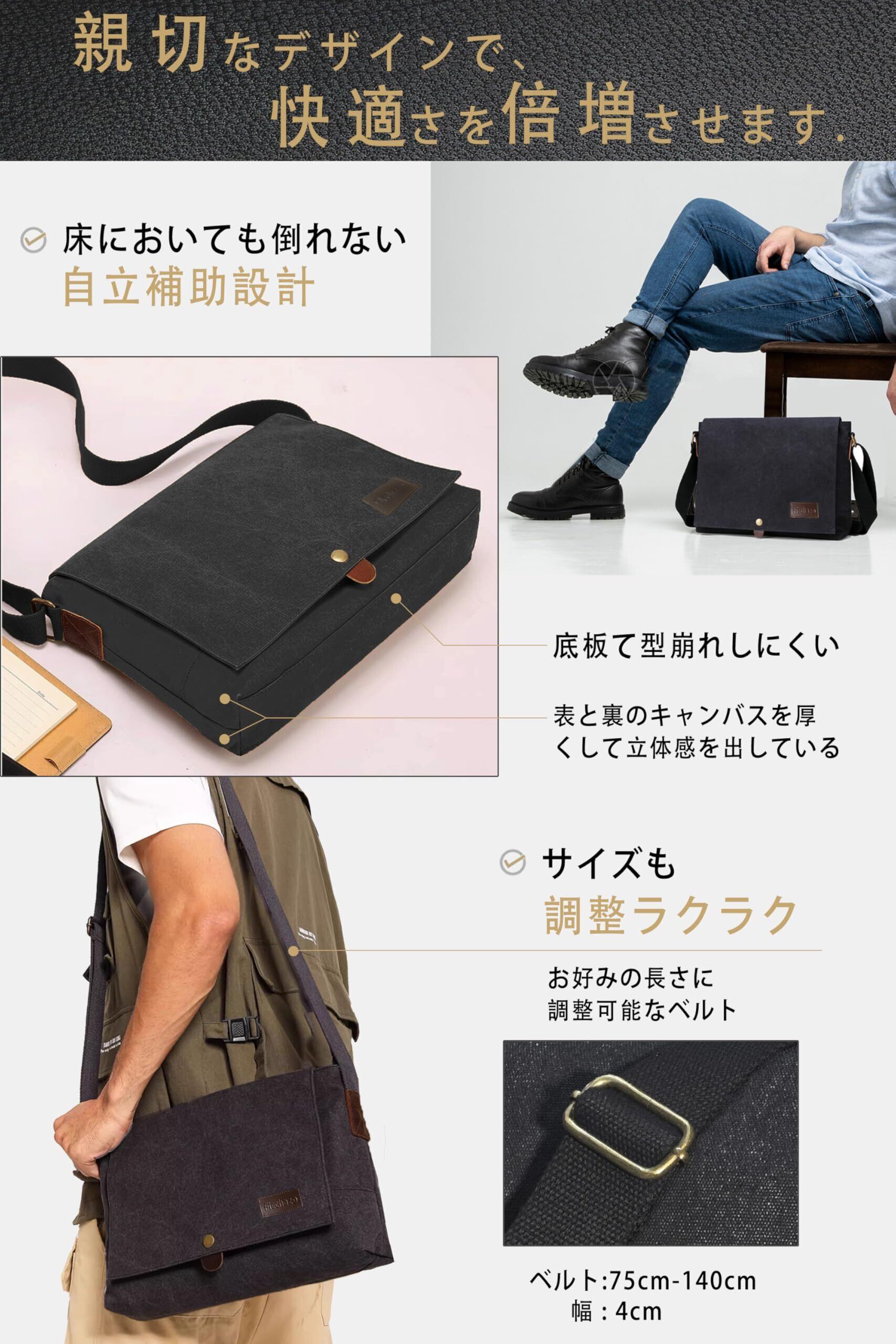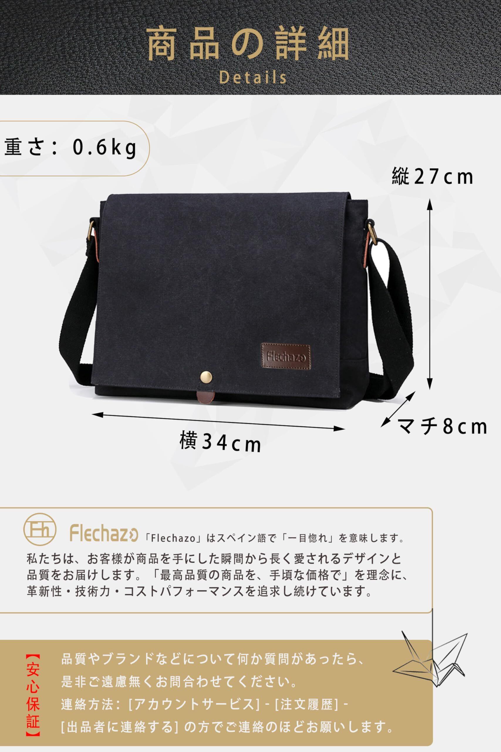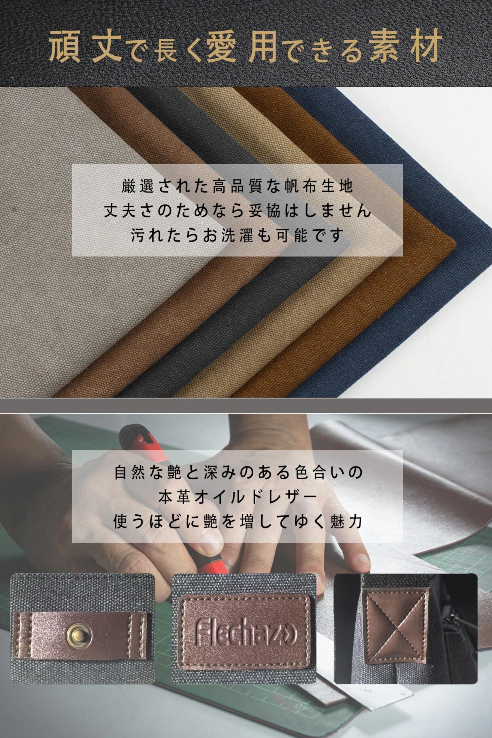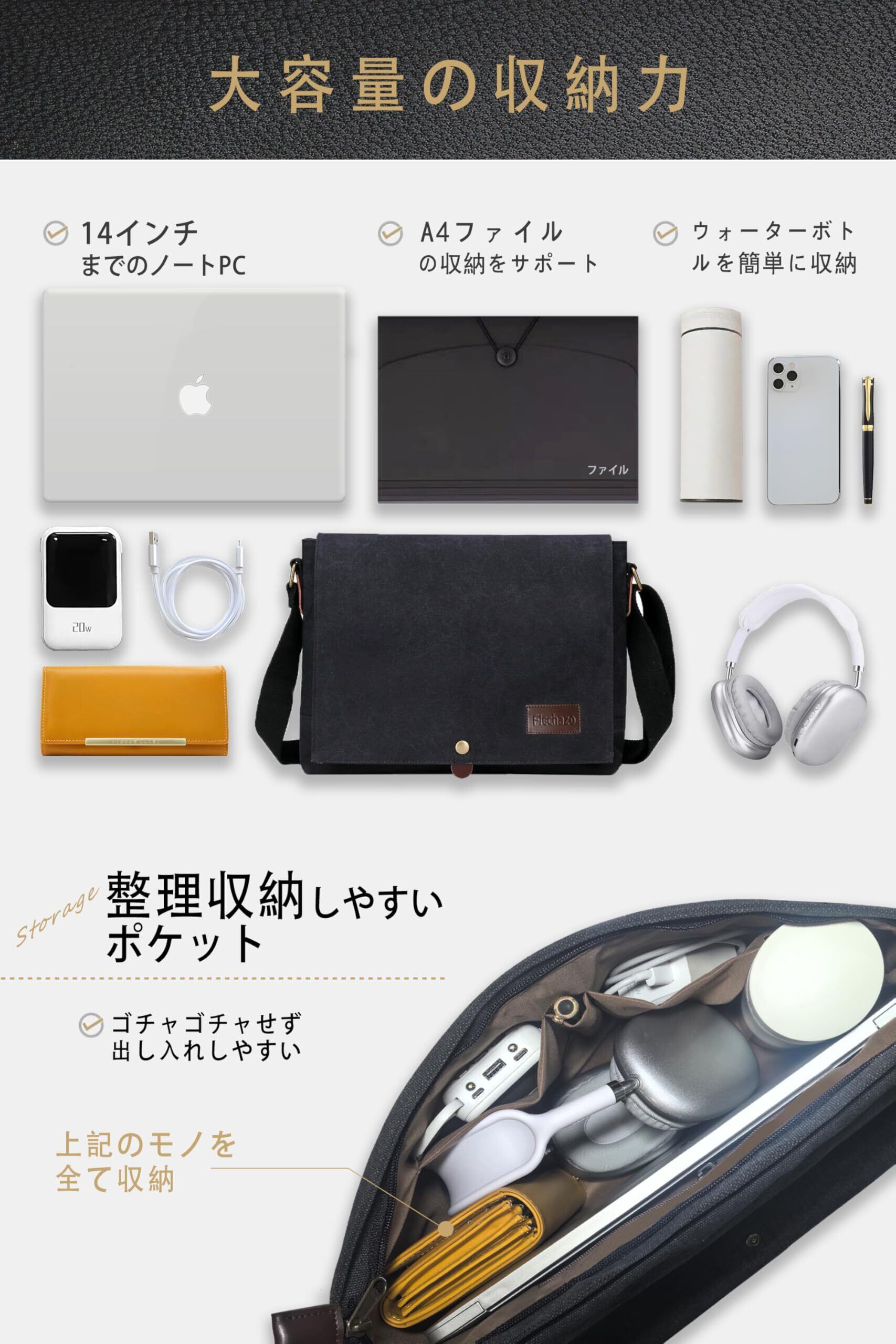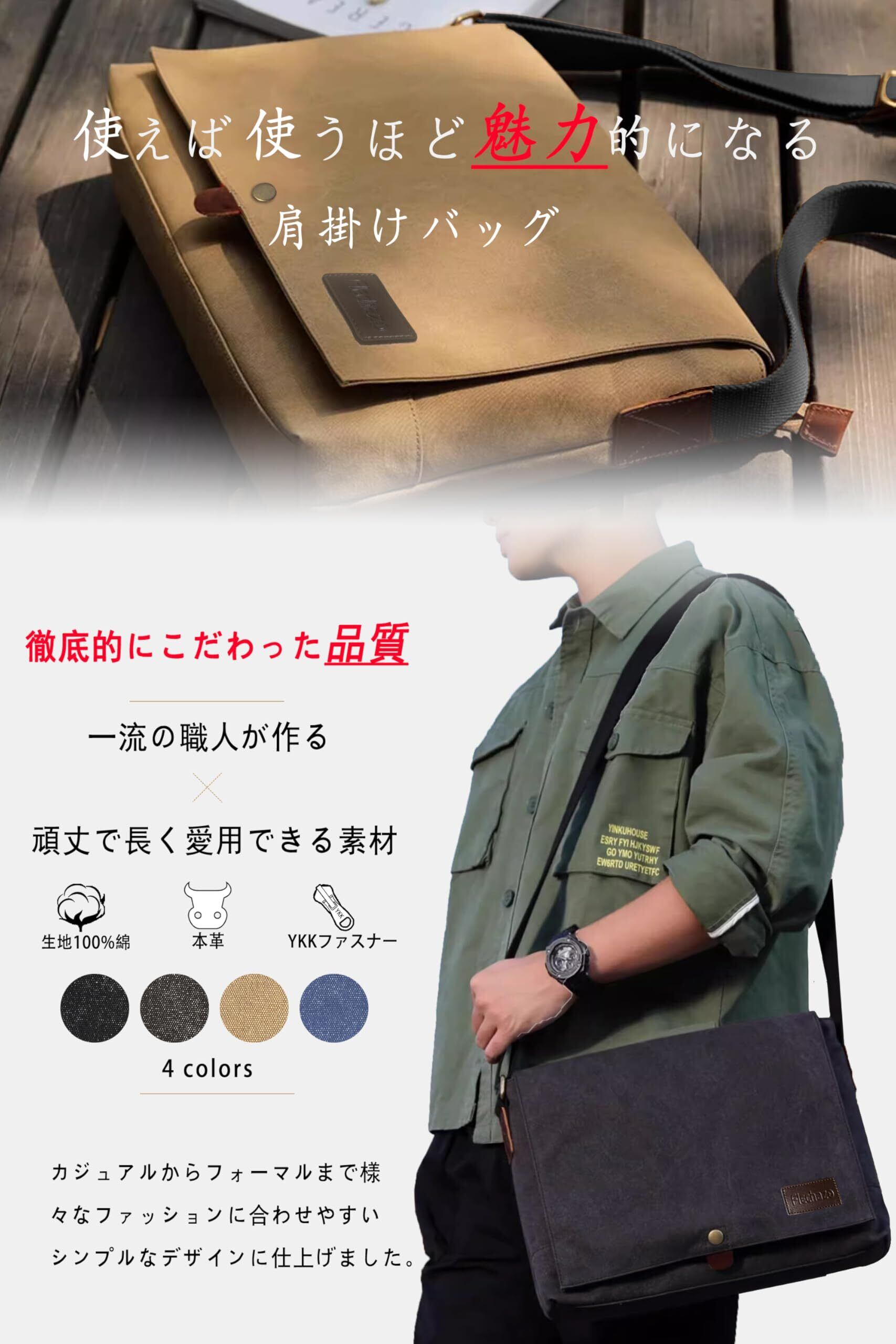 [Flechazo] ショルダーバッグ メンズ メッセンジャーバッグ 厚手帆布 育つ本革 YKKファスナー A4対応 14インチ 大容量 通勤 旅行 軽量 一生モノ