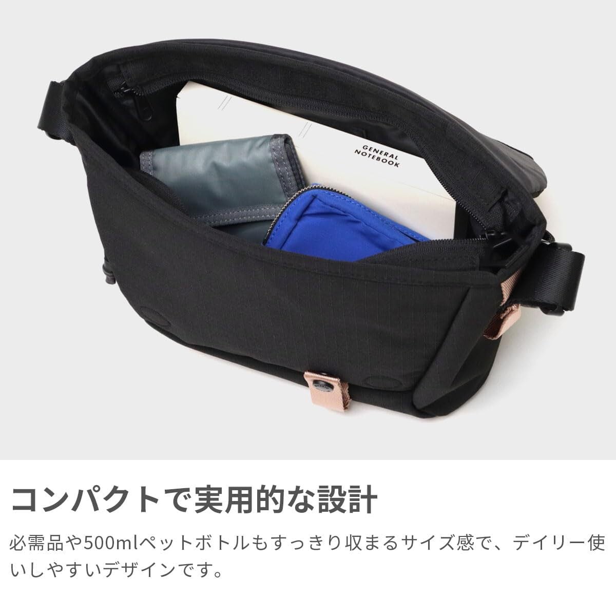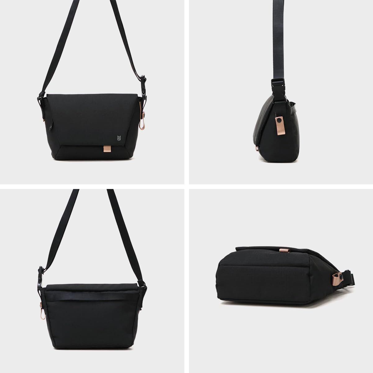 都市建築に着想を得た、幾何学的デザインのメッセンジャーバッグS。必需品や500mLペットボトルもすっきり収まるコンパクトなサイズ設計。ショルダーはワンタッチ式のバックル付きで、着脱もスムーズにできます。多角形を組み合わせた立体フォルムを生かし、各面にファスナーポケットやサイドポケット、背面ポケットなど用途に応じたポケットを整然と配置することで「収納力」に特化。