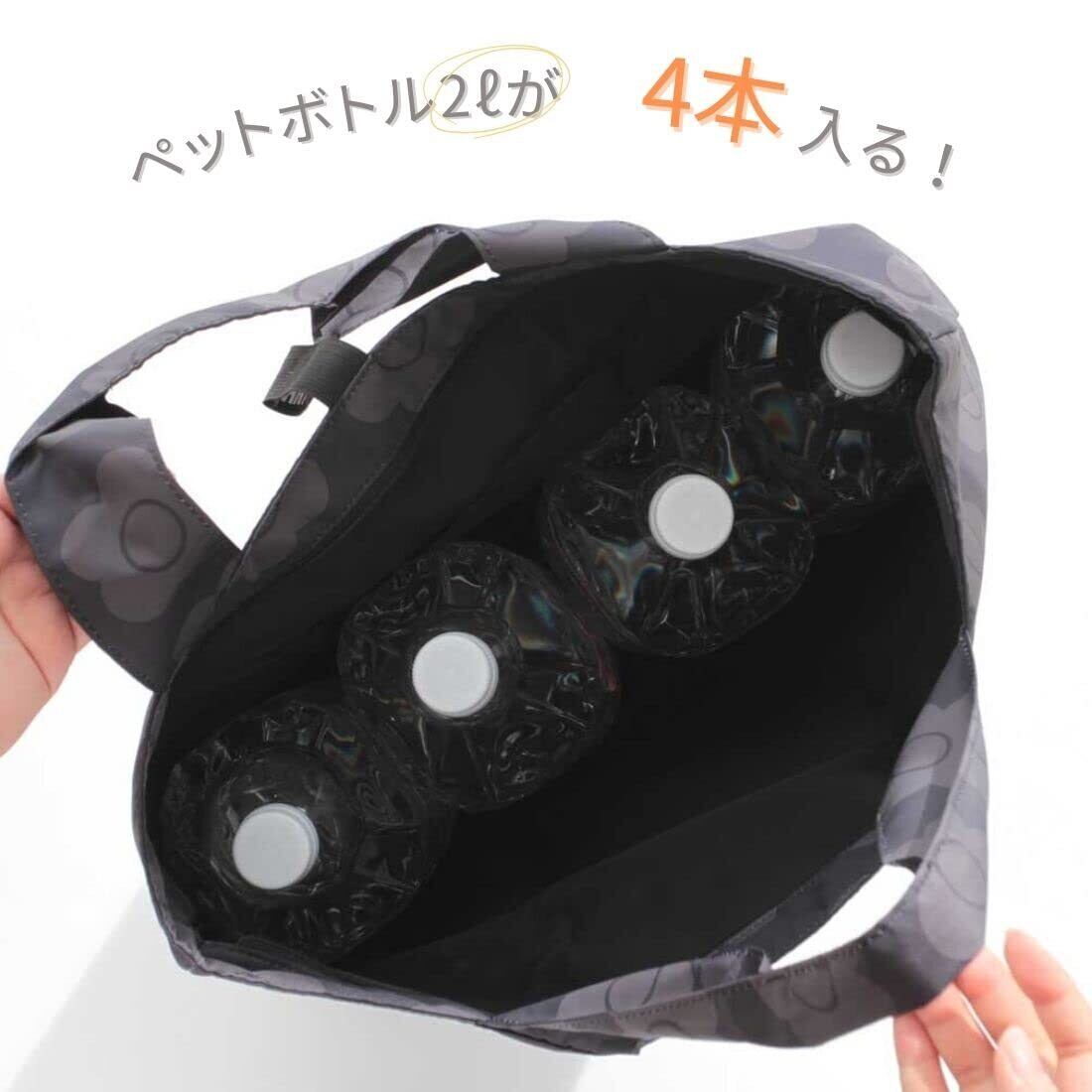 【たっぷり収納】滑らかな生地感でシャカシャカ音がしないマチ付きで大きいサイズのエコバックには、ペットボトル2リットルが4本入ります。付属のバンドでコンパクトにまとめられ、ジム通いや旅先で増えた荷物を入れるのにちょうど良いサイズ感です。
