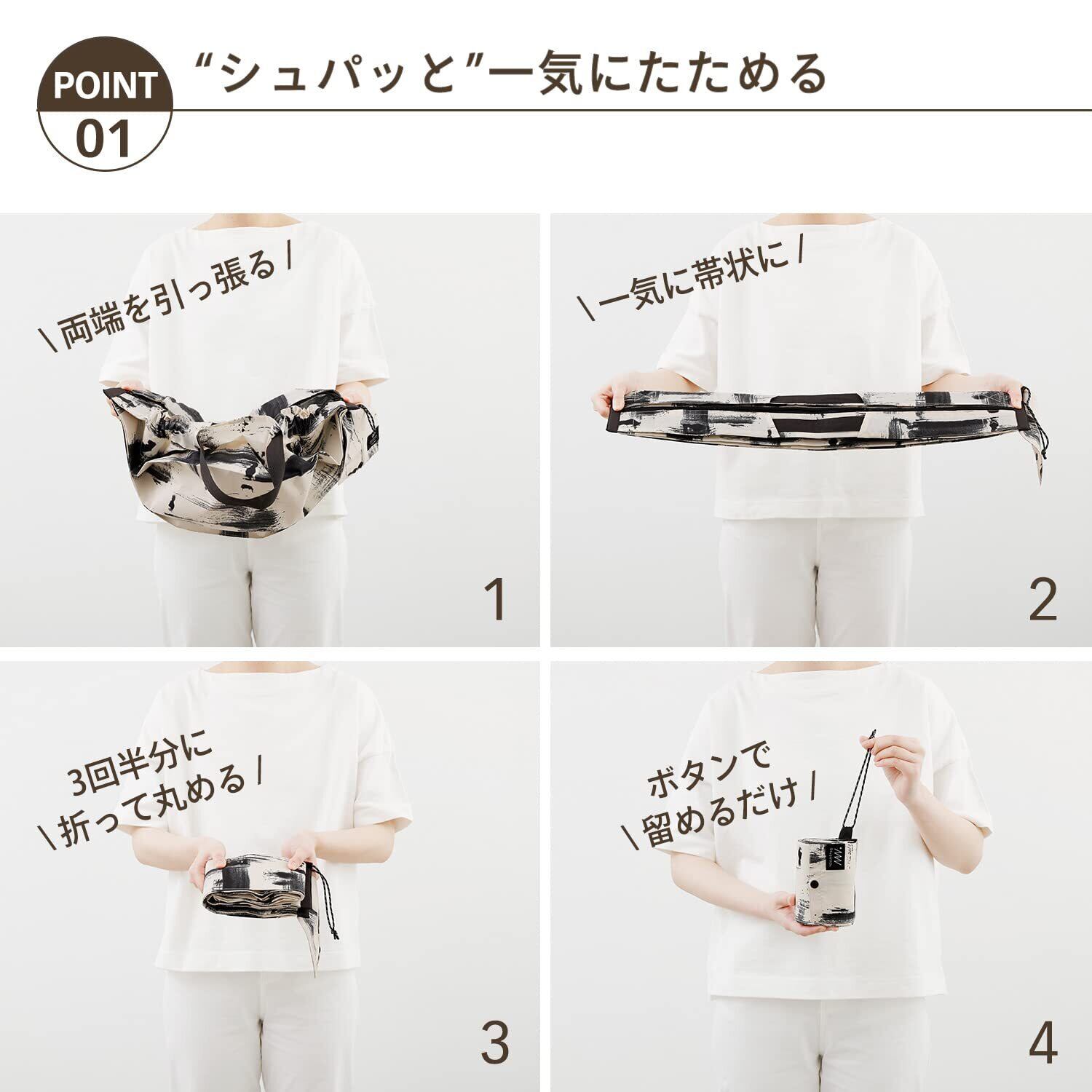 両端を“シュパッ"と引っ張って、簡単に小さくまとめられる「Shupatto」シリーズ。コンパクトに持ち運べるので、仕事帰りの買い物など、急に荷物が増えても大丈夫。