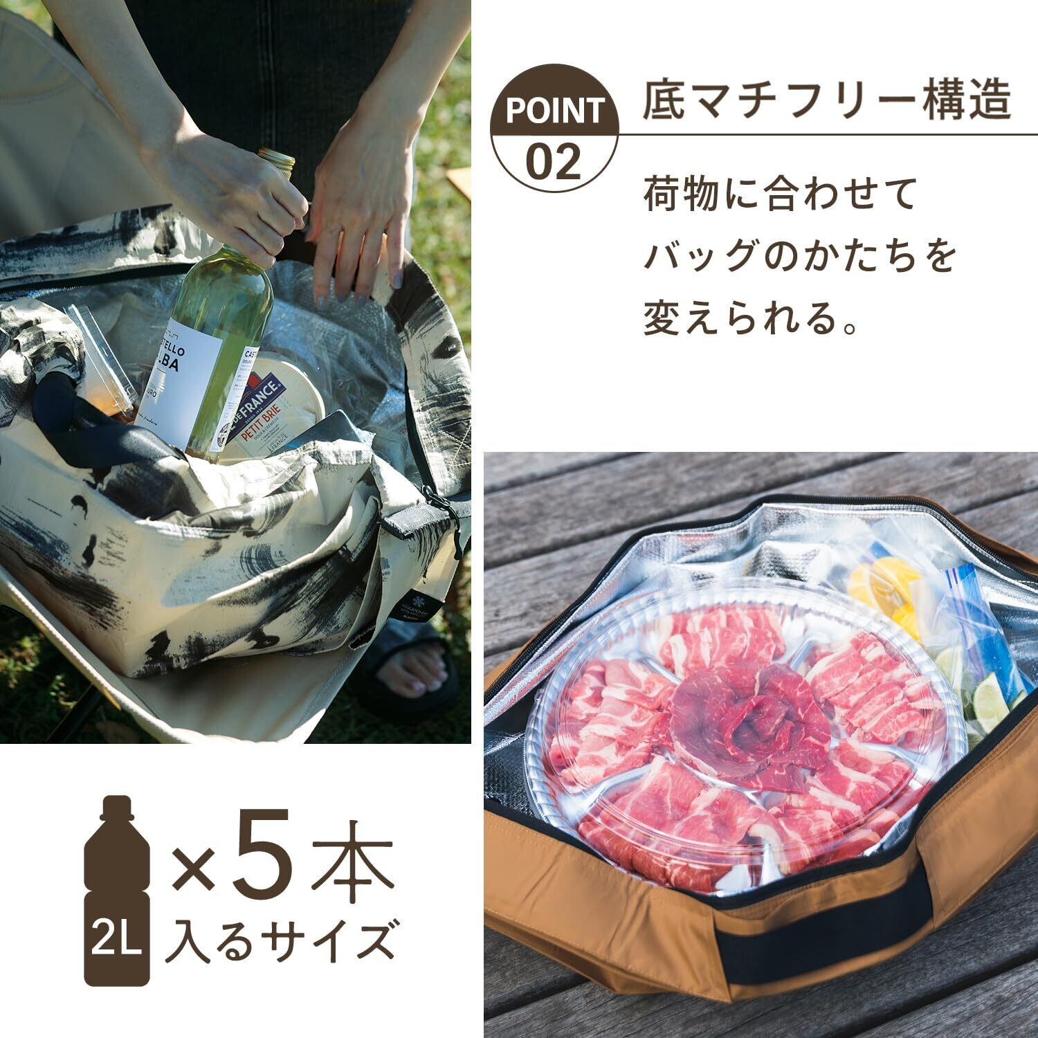 【中容量でアウトドアにも】2Lペットボトルが5本入る中容量。アウトドアでの食材の持ち運びにもおすすめです。底マチフリー構造で、底面が広いお肉のパック等もそのまま入れられます。