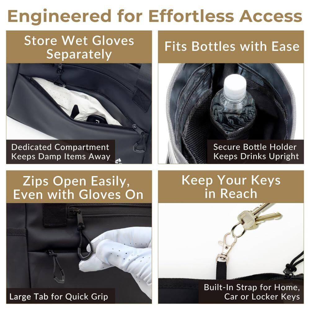 【開閉しやすいジッパーの工夫】各所のジッパーには、グローブをしていても使いやすい「ラバーグリップジッパータブ」を採用。グローブを着脱する必要なくバッグを開閉することができます。 商品仕様:本体サイズ 26cm × 22.5cm × 14cm/重量 340kg/容量 10L/素材 表地 PU(合成皮革)裏地 ポリエステル/カラー 5カラー/