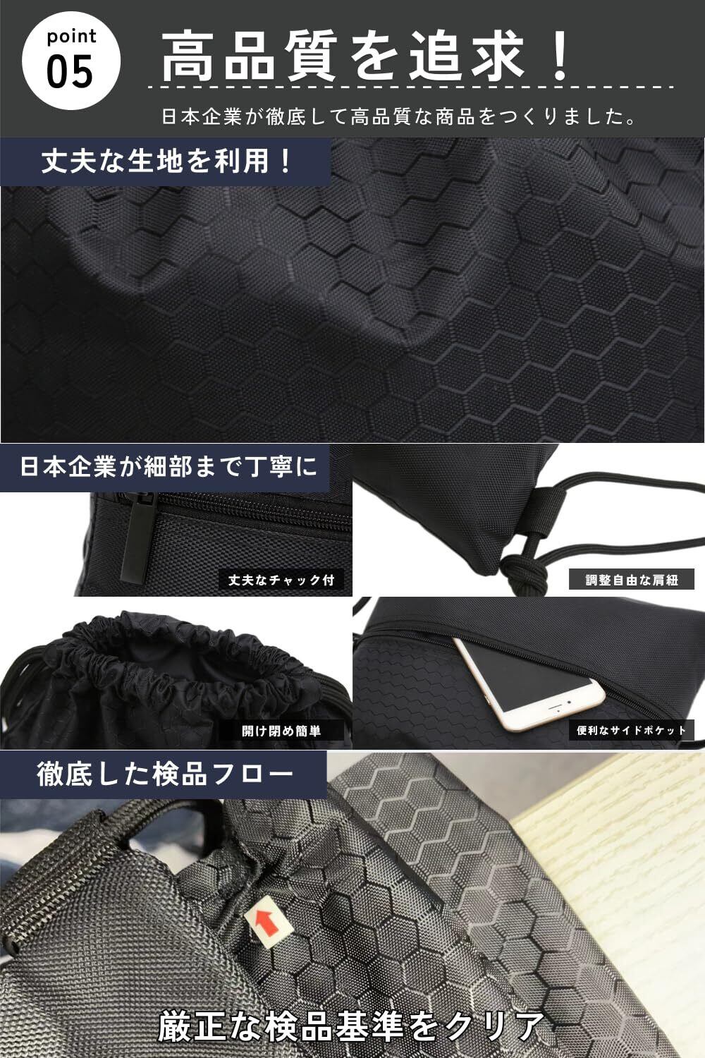 【簡単な開け閉め】利用方法は簡単。メインポケットの開け閉めは紐を引っ張る、ポケットの口元を開けるだけで完結します。繰り返し使うものだからこそ、簡単に開け閉めできることは重要です。
