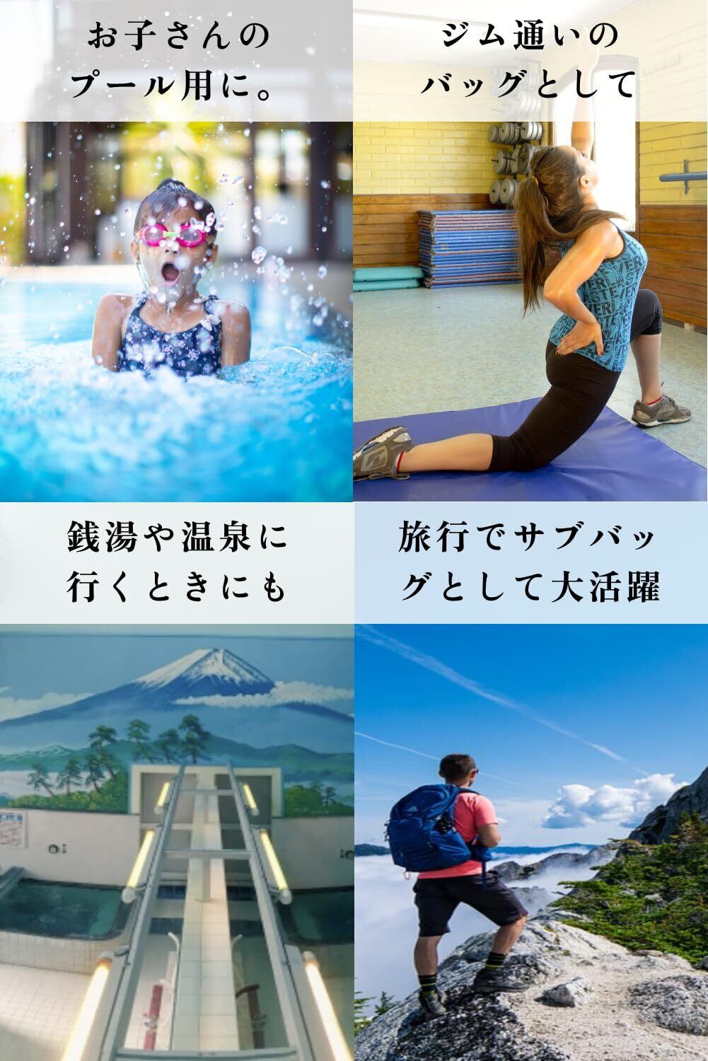 【防水, 撥水, 耐摩耗】厳正な基準をクリアした防水性、耐摩耗性。屋外での使用や繰り返しての使用でも安心してお使いいただけます。プールバッグとして濡れた衣類の収納も可能です。ジムで濡れたものを分けて入れられるのでジムバッグ・ジムサックとしても大活躍