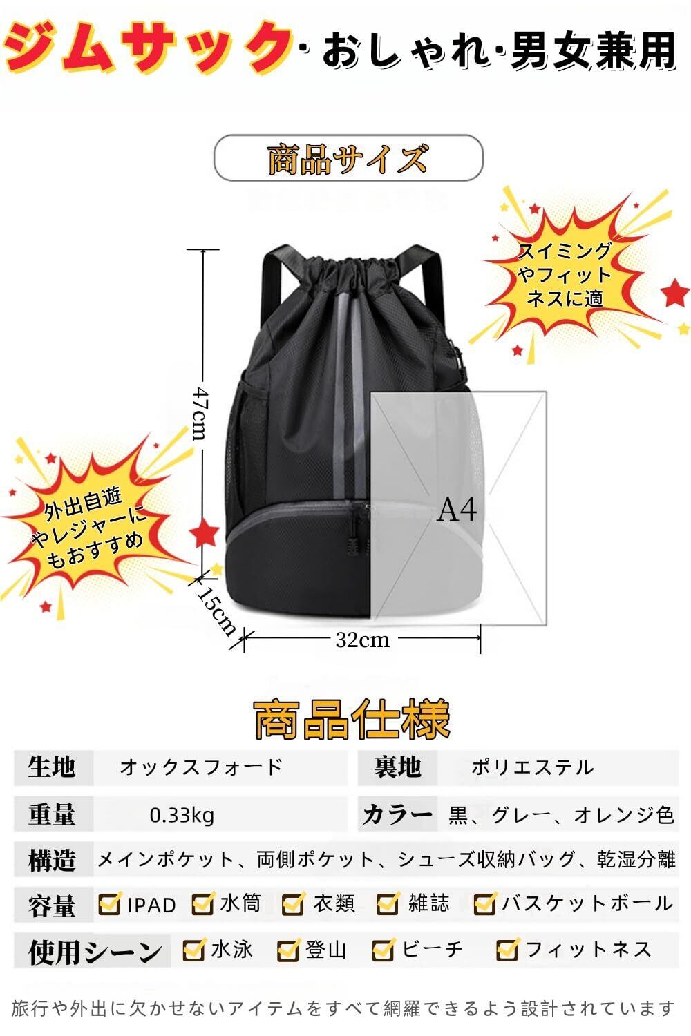 【特価商品】[Clair&Gina] ジムサック リュック シューズ収納バッグ プールバッグ 乾湿分離 スポーツバック 多機能 サイドポケット付 ナップサック 水泳 運動 遠足 男女兼用 | 無意味ステッカー