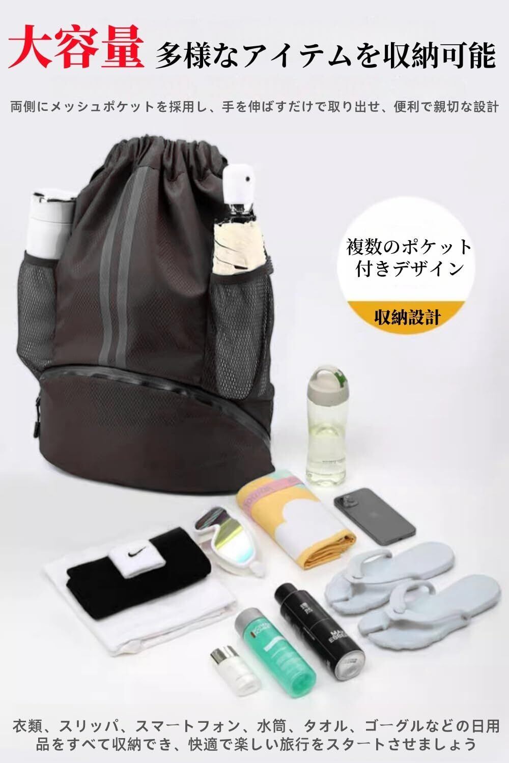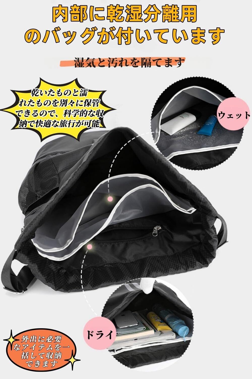 【防水設計の特長と追加機能】このナップサックは、便利な開閉システムを採用しており、アイテムの出し入れを素早く行えるだけでなく、安全性も確保します。さらに、実用的なドライ&ウェットセパレートポケットが付いており、濡れた服や水着を簡単に収納でき、他の荷物を湿らせる心配がありません。これにより、使いやすさが大幅に向上しました。また、このリュックは優れた防水性能を備えており、汗や突然の水しぶきにも対応可能で、アウトドアアクティビティに最適