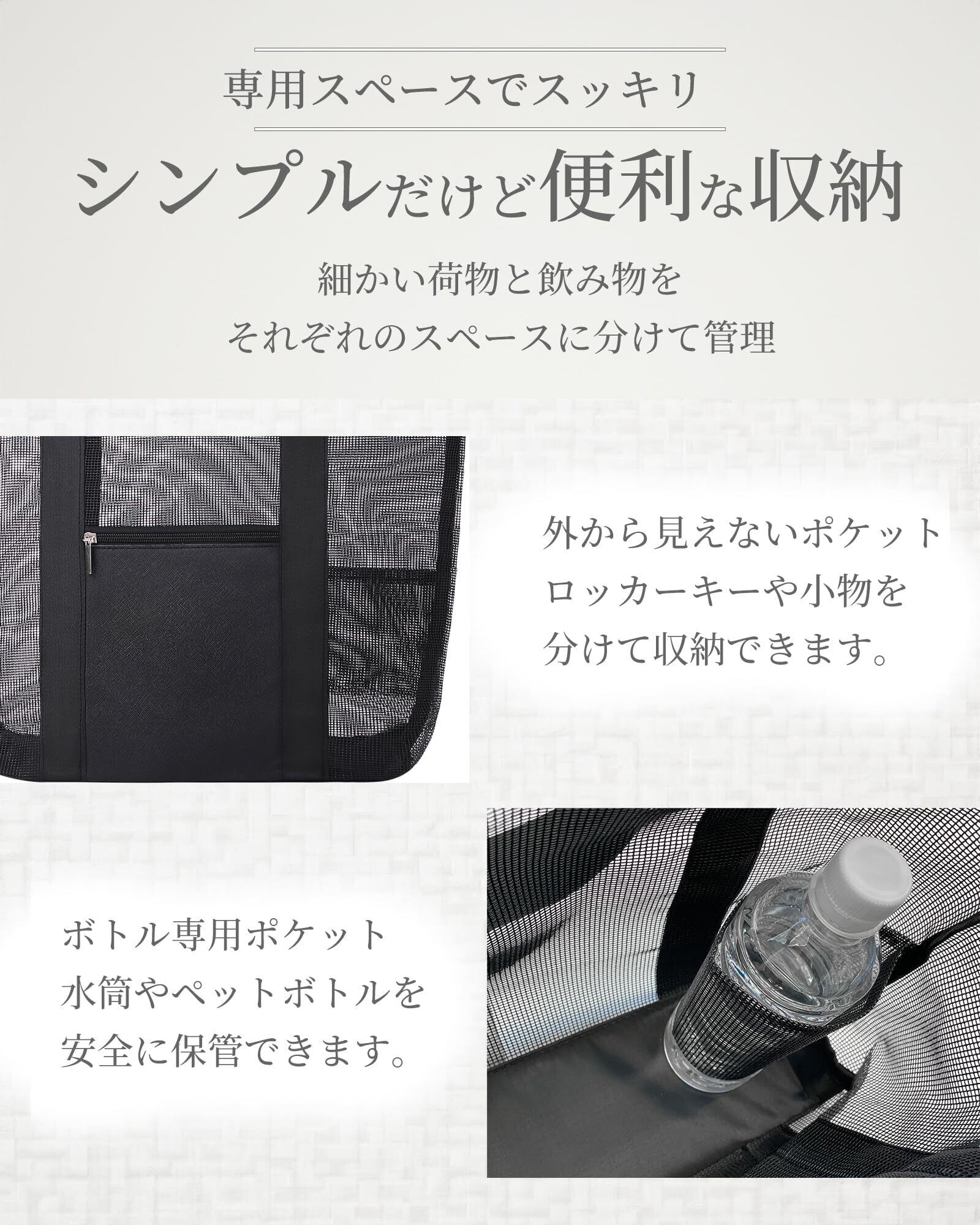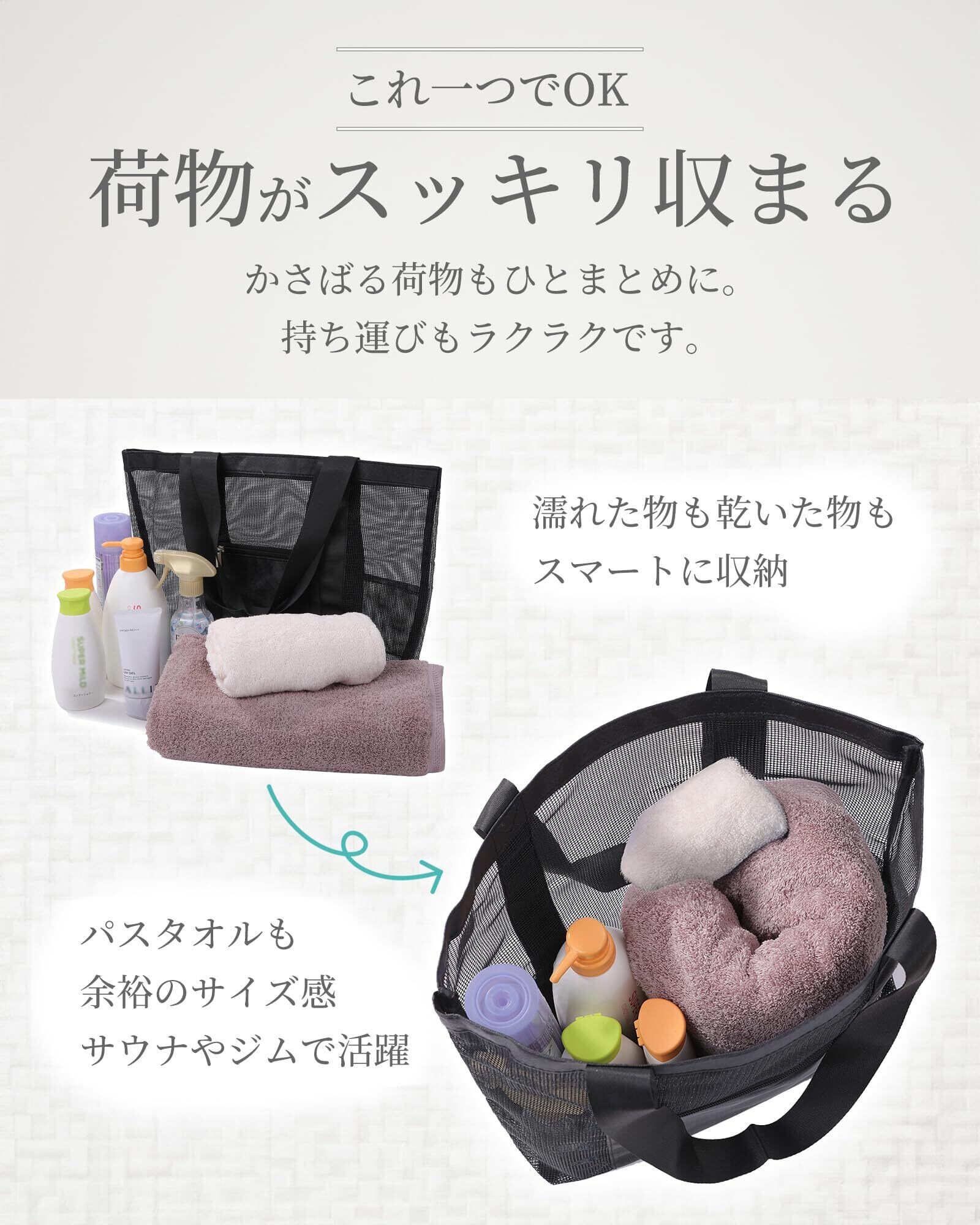 【シンプル&便利!多機能バッグ】サウナや温泉、プールやジムなど、気軽に使えるメッシュバッグです。タオルや衣類、アメニティなど、嵩張りやすい荷物もスムーズに持ち運び可能。通気性に優れたメッシュ素材を使用し、濡れたものも気兼ねなく収納でき、乾きやすい設計で清潔さを保ちます。