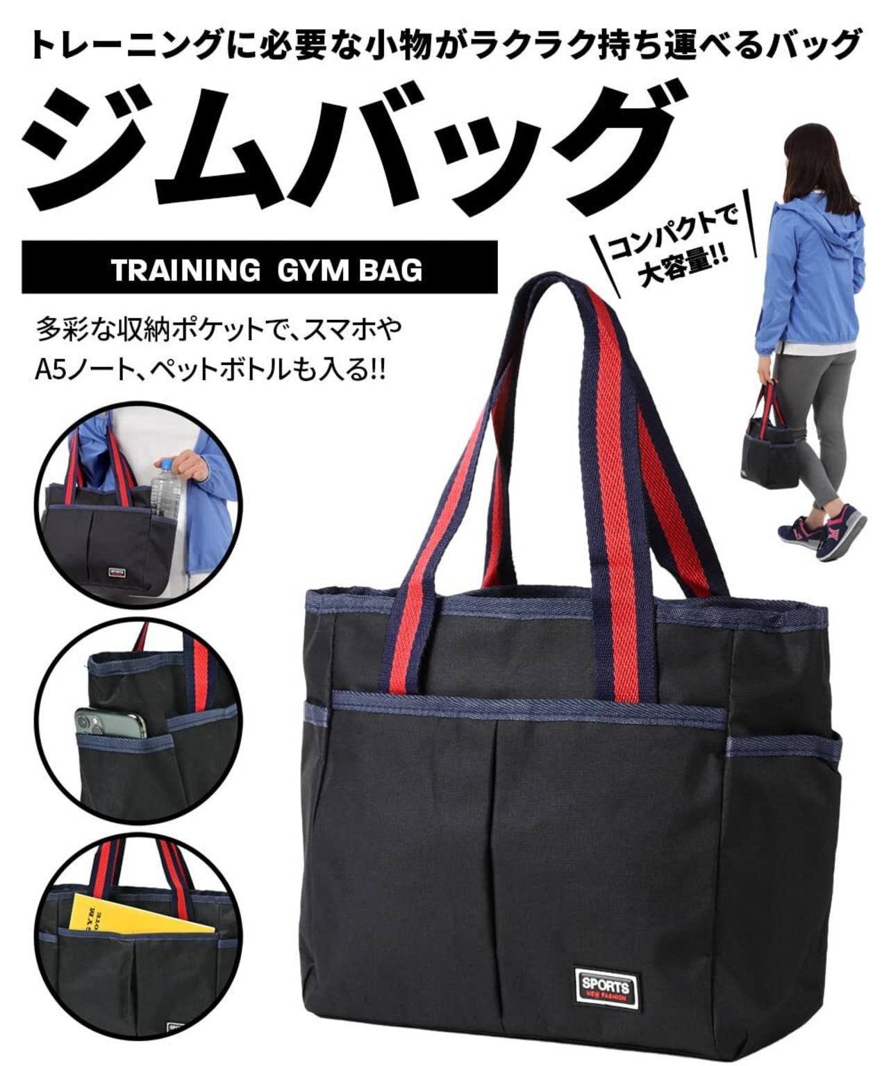 ジムのトレーニングに必要なモノを便利に持ち運べるトートバッグ。