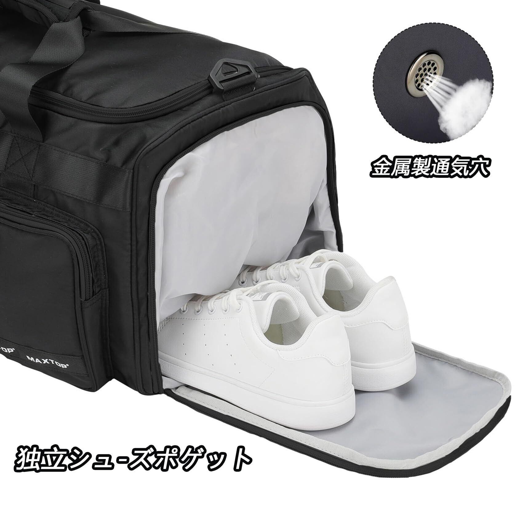 【シューズケース】メイン収納の他に、シューズ収納ポケットがあり、濡れた衣類・靴をメインポケットから分離され、他のものを汚す心配もいりません。
