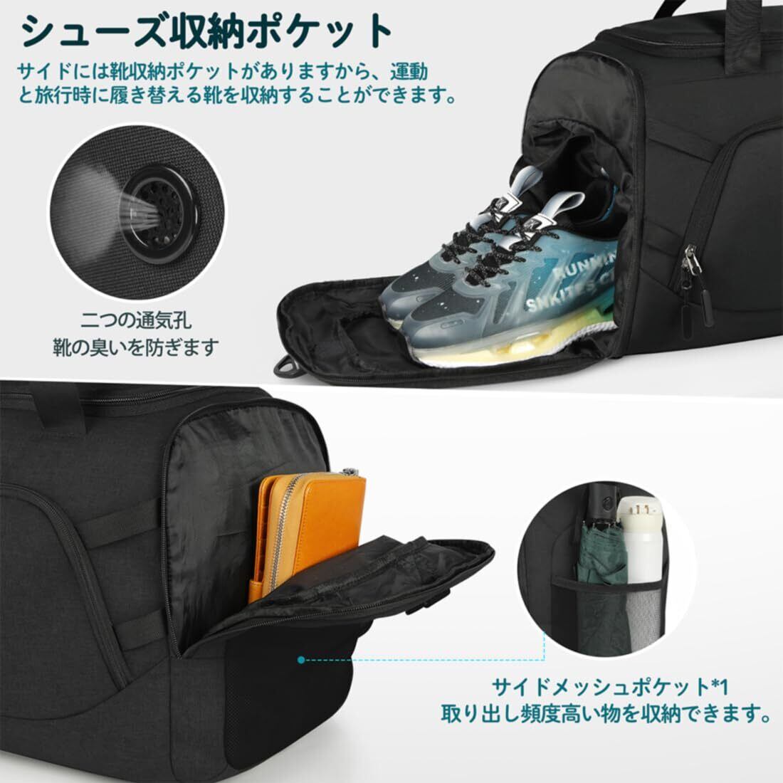 シューズ収納&乾湿分離:ダッフルバッグのサイドにシューズ収納ポケットを設け、靴が余裕で収納できる深さを備えています。運動や旅行時に履き替える靴を収納できるので便利です。また、後ろのポケットは防水素材を採用し、防水性に非常に優れています