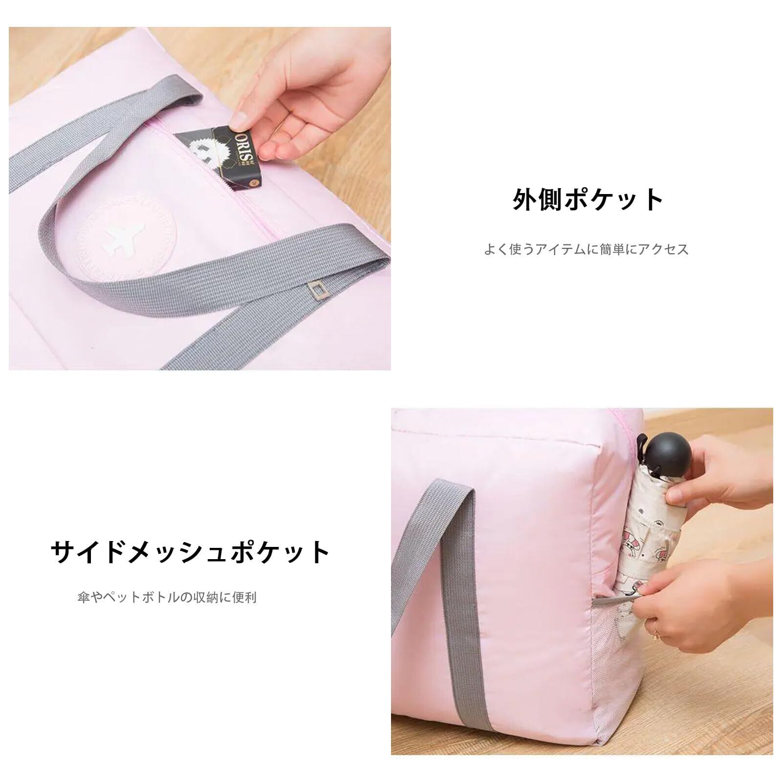 【便利な設計】よく使うものを取り出しやすくするため、外側にポケットを追加;両方向の合金ジッパー付き、開けやすく、寿命が長い;両サイドのハンドルは、よりソフトで耐久性を高めるために幅広になった;サイドには傘やペットボトルを収納しやすいメッシュポケット付き